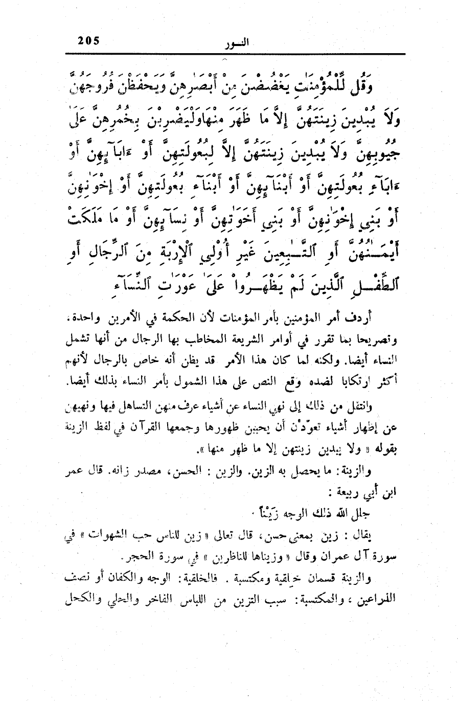 وَقُلْ لِلْمُؤْمِناتِ يَغْضُضْنَ مِنْ أَبْصارِهِنَّ وَيَحْفَظْنَ فُرُوجَهُنَّ وَلا يُبْدِينَ زِينَتَهُنَّ إِلاَّ مَا ظَهَرَ مِنْها وَلْيَضْرِبْنَ بِخُمُرِهِنَّ عَلى جُيُوبِهِنَّ وَلا يُبْدِينَ زِينَتَهُنَّ إِلاَّ لِبُعُولَتِهِنَّ أَوْ آبائِهِنَّ أَوْ آباءِ بُعُولَتِهِنَّ أَوْ أَبْنائِهِنَّ أَوْ أَبْناءِ بُعُولَتِهِنَّ أَوْ إِخْوانِهِنَّ أَوْ بَنِي إِخْوانِهِنَّ أَوْ بَنِي أَخَواتِهِنَّ أَوْ نِسائِهِنَّ أَوْ مَا مَلَكَتْ أَيْمانُهُنَّ أَوِ التَّابِعِينَ غَيْرِ أُولِي الْإِرْبَةِ مِنَ الرِّجالِ أَوِ الطِّفْلِ الَّذِينَ لَمْ يَظْهَرُوا عَلى عَوْراتِ النِّساءِ وَلا يَضْرِبْنَ بِأَرْجُلِهِنَّ لِيُعْلَمَ مَا يُخْفِينَ مِنْ زِينَتِهِنَّ وَتُوبُوا إِلَى اللَّهِ جَمِيعاً أَيُّهَا الْمُؤْمِنُونَ لَعَلَّكُمْ تُفْلِحُونَ (31)