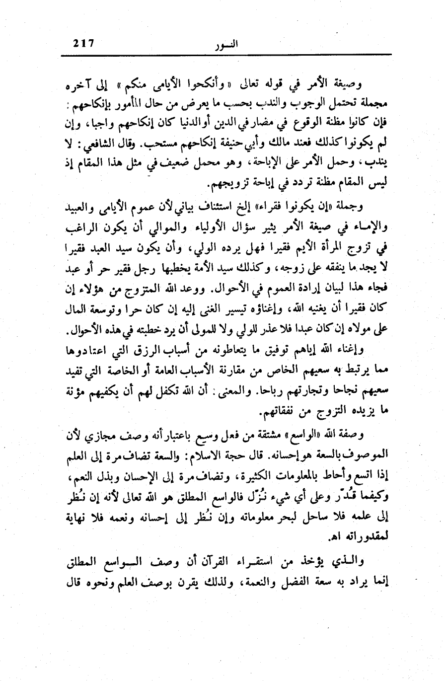 وَجُمْلَةُ: إِنْ يَكُونُوا فُقَراءَ إِلَخْ اسْتِئْنَافٌ بَيَانِيٌّ لِأَنَّ عُمُومَ الْأَيَامَى وَالْعَبِيدِ وَالْإِمَاءِ فِي صِيغَةِ الْأَمْرِ يُثِيرُ سُؤَالَ الْأَوْلِيَاءِ وَالْمَوَالِي أَنْ يَكُونُ الرَّاغِبُ فِي تَزَوُّجِ الْمَرْأَةِ الْأَيِّمِ فَقِيرًا فَهَل يردهُ الْوَلِيّ، وَأَنْ يكون سيد العَبْد فَقِيرًا لَا يَجِدُ مَا يُنْفِقُهُ عَلَى زَوْجِهِ، وَكَذَلِكَ سَيِّدُ الْأَمَةِ يَخْطُبُهَا رَجُلٌ فَقِيرٌ حُرٌّ أَوْ عَبْدٌ فَجَاءَ هَذَا لِبَيَانِ إِرَادَةِ الْعُمُومِ فِي الْأَحْوَالِ. وَوَعَدَ اللَّهُ الْمُتَزَوِّجَ مِنْ هَؤُلَاءِ إِنْ كَانَ فَقِيرًا أَنْ يُغْنِيَهُ اللَّهُ، وَإِغْنَاؤُهُ تَيْسِيرُ الْغِنَى إِلَيْهِ إِنْ كَانَ حُرًّا وَتَوْسِعَةُ الْمَالِ عَلَى مَوْلَاهُ إِنْ كَانَ عَبْدًا فَلَا عُذْرَ لِلْوَلِيِّ وَلَا لِلْمَوْلَى أَنْ يَرَدَّ خِطْبَتَهُ فِي هَذِهِ الْأَحْوَالِ.