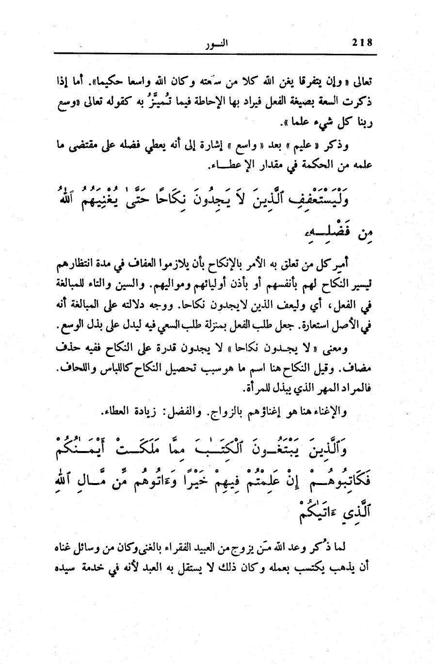 وَمَعْنَى لَا يَجِدُونَ نِكاحاً لَا يَجِدُونَ قُدْرَةً عَلَى النِّكَاحِ فَفِيهِ حَذْفُ مُضَافٍ. وَقِيلَ النِّكَاحُ هُنَا اسْمُ مَا هُوَ سَبَبُ تَحْصِيلِ النِّكَاحِ كَاللِّبَاسِ وَاللِّحَافِ. فَالْمُرَادُ الْمَهْرُ الَّذِي يُبْذَلُ لِلْمَرْأَةِ.