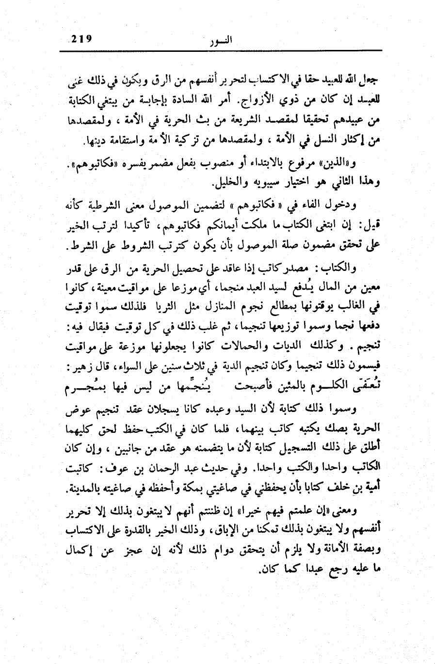 وَالْكِتَابُ: مَصْدَرُ كَاتَبَ إِذَا عَاقَدَ عَلَى تَحْصِيلِ الْحُرِّيَّةِ مِنَ الرِّقِّ عَلَى قَدْرٍ مُعَيَّنٍ مِنَ الْمَالِ يُدْفَعُ لِسَيِّدِ الْعَبْدِ مُنَجَّمًا، أَيْ مُوَزَّعًا عَلَى مَوَاقِيتَ مُعَيَّنَةٍ، كَانُوا فِي الْغَالِبِ يُوَقِّتُونَهَا بِمَطَالِعِ نُجُومِ الْمَنَازِلِ مِثْلَ الثُّرَيَّا فَلِذَلِكَ سَمَّوْا تَوْقِيتَ دَفْعِهَا نَجْمًا وَسَمَّوْا تَوْزِيعَهَا تَنْجِيمًا، ثُمَّ غَلَبَ ذَلِكَ فِي كُلِّ تَوْقِيتٍ فَيُقَالُ فِيهِ: تَنْجِيمٌ. وَكَذَلِكَ الدِّيَّاتُ وَالْحَمَالَاتُ كَانُوا يَجْعَلُونَهَا مُوَزَّعَةً عَلَى مَوَاقِيتَ فَيُسَمُّونَ ذَلِكَ تَنْجِيمًا وَكَانَ تَنْجِيمُ الدِّيَةِ فِي ثَلَاثِ سِنِينَ عَلَى السَّوَاءِ، قَالَ زُهَيْرٌ: