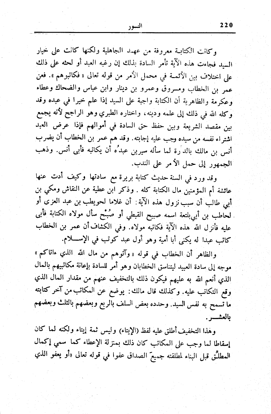 وَكَانَتِ الْكِتَابَةُ مَعْرُوفَةً مِنْ عَهْدِ الْجَاهِلِيَّةِ وَلَكِنَّهَا كَانَتْ عَلَى خِيَارِ السَّيِّدِ فَجَاءَتْ هَذِهِ الْآيَةُ تَأْمُرُ السَّادَةَ بِذَلِكَ إِنْ رَغِبَهُ الْعَبْدُ أَوْ لِحَثِّهِ عَلَى ذَلِكَ عَلَى اخْتِلَاف بَين الْأَئِمَّة فِي مَحْمَلِ الْأَمْرِ مِنْ قَوْلِهِ تَعَالَى: فَكاتِبُوهُمْ. فَعَنْ عُمَرَ بْنِ الْخَطَّابِ وَمَسْرُوقٍ وَعَمْرِو بْنِ