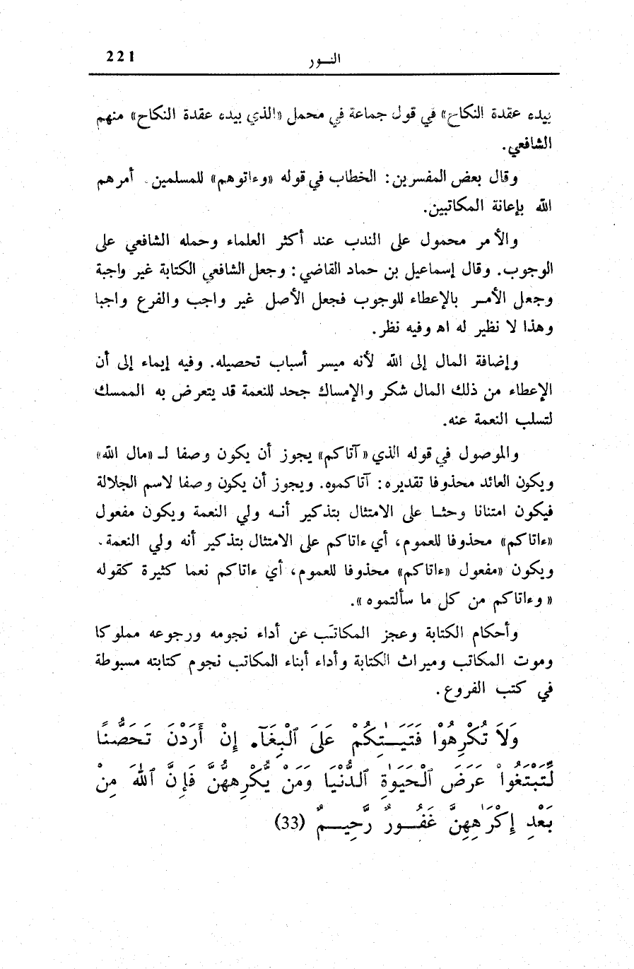 وَالْأَمْرُ مَحْمُولٌ عَلَى النَّدْبِ عِنْدَ أَكْثَرِ الْعُلَمَاءِ وَحَمَلَهُ الشَّافِعِيُّ عَلَى الْوُجُوبِ. وَقَالَ إِسْمَاعِيلُ بْنُ حَمَّادٍ الْقَاضِي: وَجَعَلَ الشَّافِعِيُّ الْكِتَابَةَ غَيْرَ وَاجِبَةٍ وَجَعَلَ الْأَمْرَ بِالْإِعْطَاءِ لِلْوُجُوبِ فَجَعَلَ الْأَصْلَ غَيْرَ وَاجِبٍ وَالْفَرْعَ وَاجِبًا وَهَذَا لَا نَظِيرَ لَهُ اهـ. وَفِيهِ نَظَرٌ.
