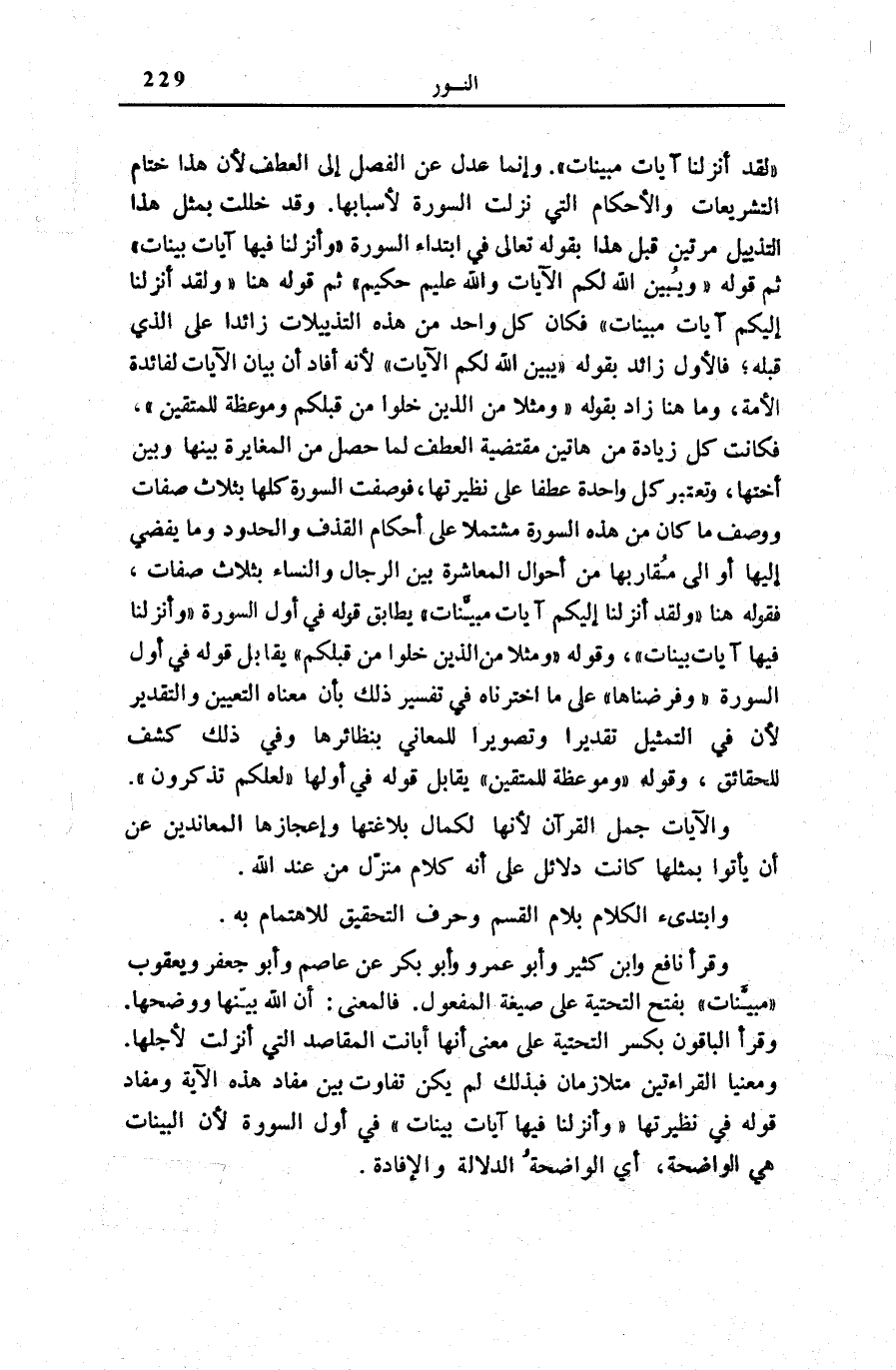 وَيُبَيِّنُ اللَّهُ لَكُمُ الْآياتِ وَاللَّهُ عَلِيمٌ حَكِيمٌ [النُّور: 18] ثُمَّ قَوْلُهُ هُنَا: وَلَقَدْ أَنْزَلْنا إِلَيْكُمْ آياتٍ مُبَيِّناتٍ فَكَانَ كُلُّ وَاحِدٍ مِنْ هَذِهِ التَّذْيِيلَاتِ زَائِدًا عَلَى الَّذِي قَبْلَهُ فَالْأَوَّلُ زَائِدٌ بِقَوْلِهِ: يُبَيِّنُ اللَّهُ لَكُمُ الْآياتِ [النُّور: 18] لِأَنَّهُ أَفَادَ أَنَّ بَيَانَ الْآيَاتِ لِفَائِدَةِ الْأُمَّةِ، وَمَا هُنَا زَادَ بِقَوْلِهِ: وَمَثَلًا مِنَ الَّذِينَ خَلَوْا مِنْ قَبْلِكُمْ وَمَوْعِظَةً لِلْمُتَّقِينَ. فَكَانَتْ كُلُّ زِيَادَةٍ مِنْ هَاتَيْنِ مُقْتَضِيَةً الْعَطْفَ لِمَا حَصَلَ مِنَ الْمُغَايَرَةِ بَيْنَهَا وَبَيْنَ أُخْتِهَا، وَتُعْتَبَرُ كُلُّ وَاحِدَةٍ عَطْفًا عَلَى نَظِيرَتِهَا، فَوُصِفَتِ السُّورَةُ كُلُّهَا بِثَلَاثِ صِفَاتٍ وَوُصِفَ مَا كَانَ مِنْ هَذِهِ السُّورَةِ مُشْتَمِلًا عَلَى أَحْكَامِ الْقَذْفِ وَالْحُدُودِ وَمَا يُفْضِي إِلَيْهَا أَوْ إِلَى مُقَارِبِهَا مِنْ أَحْوَالِ الْمُعَاشَرَةِ بَيْنَ الرِّجَالِ وَالنِّسَاءِ بِثَلَاثِ صِفَاتٍ، فَقَوْلُهُ هُنَا: وَلَقَدْ أَنْزَلْنا إِلَيْكُمْ آياتٍ مُبَيِّناتٍ يُطَابِقُ قَوْلَهُ فِي أَوَّلِ السُّورَةِ وَأَنْزَلْنا فِيها آياتٍ بَيِّناتٍ [النُّور: 1] ، وَقَوْلُهُ: وَمَثَلًا مِنَ الَّذِينَ خَلَوْا مِنْ قَبْلِكُمْ يُقَابِلُ قَوْلَهُ فِي أَوَّلِ السُّورَة وَفَرَضْناها [النُّور: 1] عَلَى مَا اخْتَرْنَاهُ فِي تَفْسِيرِ ذَلِكَ بِأَنَّ مَعْنَاهُ التَّعْيِينُ وَالتَّقْدِيرُ لِأَنَّ فِي التَّمْثِيلِ تَقْدِيرًا وَتَصْوِيرًا لِلْمَعَانِي بِنَظَائِرِهَا وَفِي ذَلِكَ كَشْفٌ لِلْحَقَائِقِ، وَقَوْلُهُ: وَمَوْعِظَةً لِلْمُتَّقِينَ يُقَابِلُ قَوْلَهُ فِي أَوَّلِهَا لَعَلَّكُمْ تَذَكَّرُونَ [النُّور: 1] .