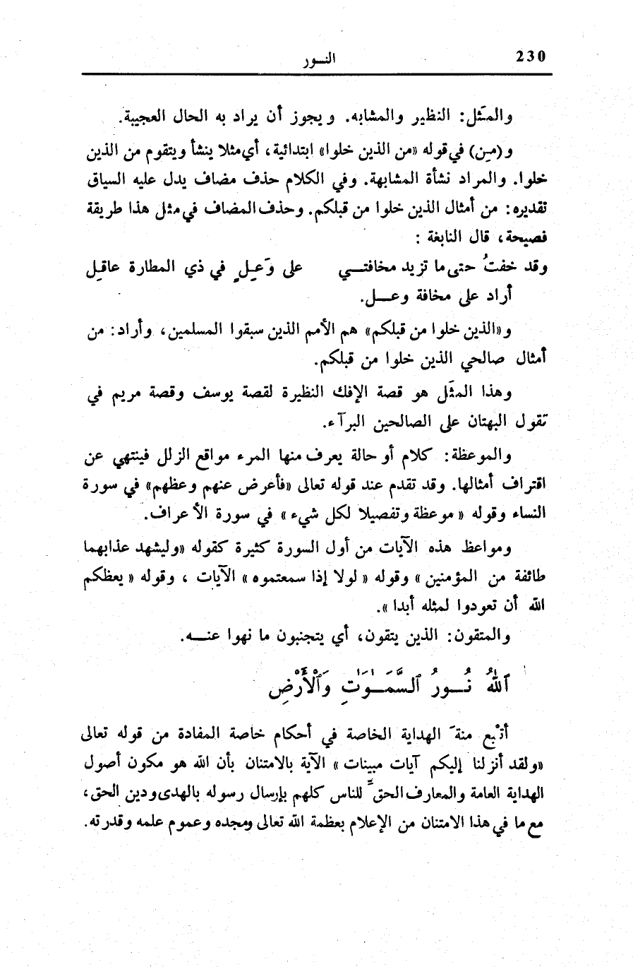 وَمَوَاعِظُ هَذِهِ الْآيَاتِ مِنْ أَوَّلِ السُّورَةِ كَثِيرَةٌ كَقَوْلِهِ: وَلْيَشْهَدْ عَذابَهُما طائِفَةٌ مِنَ الْمُؤْمِنِينَ [النُّور: 2] وَقَوْلِهِ: لَوْلا إِذْ سَمِعْتُمُوهُ [النُّور: 12] الْآيَاتِ، وَقَوْلِهِ: يَعِظُكُمُ اللَّهُ أَنْ تَعُودُوا لِمِثْلِهِ أَبَداً [النُّور: 17] .