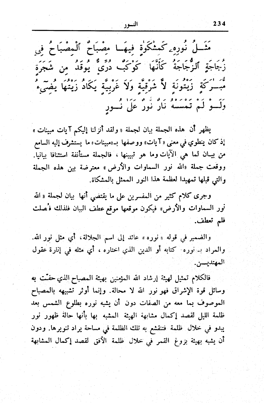 الصِّفَاتِ دُونَ أَنْ يُشَبَّهَ نُورُهُ بِطُلُوعِ الشَّمْسِ بَعْدَ ظُلْمَةِ اللَّيْلِ لِقَصْدِ إِكْمَالِ مُشَابَهَةِ الْهَيْئَةِ الْمُشَبَّهِ بِهَا بِأَنَّهَا حَالَةُ ظُهُورِ نُورٍ يَبْدُو فِي خِلَالِ ظُلْمَةٍ فَتَنْقَشِعُ بِهِ تِلْكَ الظُّلْمَةُ فِي مِسَاحَةٍ يُرَادُ تَنْوِيرُهَا. وَدُونَ أَنْ يُشَبَّهَ بِهَيْئَةِ بُزُوغِ الْقَمَرِ فِي خِلَالِ ظُلْمَةِ الْأُفُقِ لِقَصْدِ إِكْمَالِ الْمُشَابَهَةِ