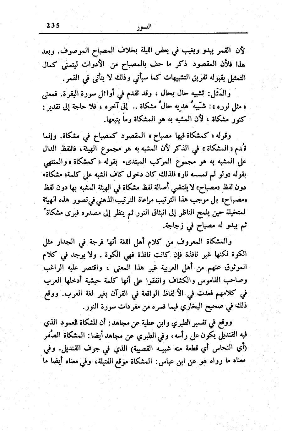 وَقَوْلُهُ: كَمِشْكاةٍ فِيها مِصْباحٌ الْمَقْصُودُ كَمِصْبَاحٍ فِي مِشْكَاةٍ. وَإِنَّمَا قَدَّمَ الْمِشْكَاةَ فِي الذِّكْرِ لِأَنَّ الْمُشَبَّهَ بِهِ هُوَ مَجْمُوعُ الْهَيْئَةِ، فَاللَّفْظُ الدَّالُّ عَلَى الْمُشَبَّهِ بِهِ هُوَ مَجْمُوعُ الْمُرَكَّبِ الْمُبْتَدَئِ بِقَوْلِهِ: كَمِشْكاةٍ وَالْمُنْتَهِي بِقَوْلِهِ: وَلَوْ لَمْ تَمْسَسْهُ نارٌ فَلِذَلِكَ كَانَ دُخُولُ كَافِ الشَّبَهِ عَلَى كَلِمَةِ مِشْكَاةٍ دُونَ لَفْظِ مِصْباحٌ لَا يَقْتَضِي أَصَالَةَ لَفْظِ مِشْكَاةٍ فِي الْهَيْئَةِ الْمُشَبَّهِ بِهَا دُونَ لَفْظِ مِصْباحٌ بَلْ مُوجِبُ هَذَا التَّرْتِيبِ مُرَاعَاةُ التَّرْتِيبِ الذِّهْنِيِّ فِي تَصَوُّرِ هَذِه الْهَيْئَة المتخيلة حِينَ يَلْمَحَ النَّاظِرُ إِلَى انْبِثَاقِ النُّورِ ثُمَّ يَنْظُرُ إِلَى مَصْدَرِهِ فَيَرَى مِشْكَاةً ثُمَّ يَبْدُو لَهُ مِصْبَاحٌ فِي زُجَاجَةٍ.