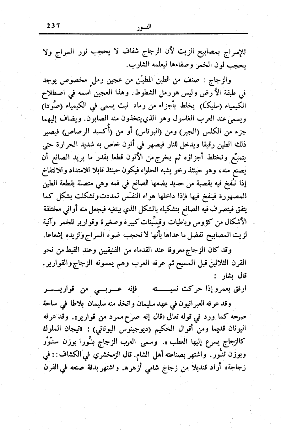 وَسَمَّى الْعَرَبُ الزُّجَاجَ بِلَّوْرًا بِوَزْنِ سِنَّوْرٍ وَبِوَزْنِ تَنُّورٍ. وَاشْتُهِرَ بِصِنَاعَتِهِ أَهْلُ الشَّامِ. قَالَ الزَّمَخْشَرِيُّ فِي «الْكَشَّافِ» : فِي زُجاجَةٍ أَرَادَ قِنْدِيلًا مِنْ زُجَاجٍ شَامي أَزْهَر اهـ. وَاشْتُهِرَ بِدِقَّةِ صُنْعِهِ فِي الْقَرْنِِِ