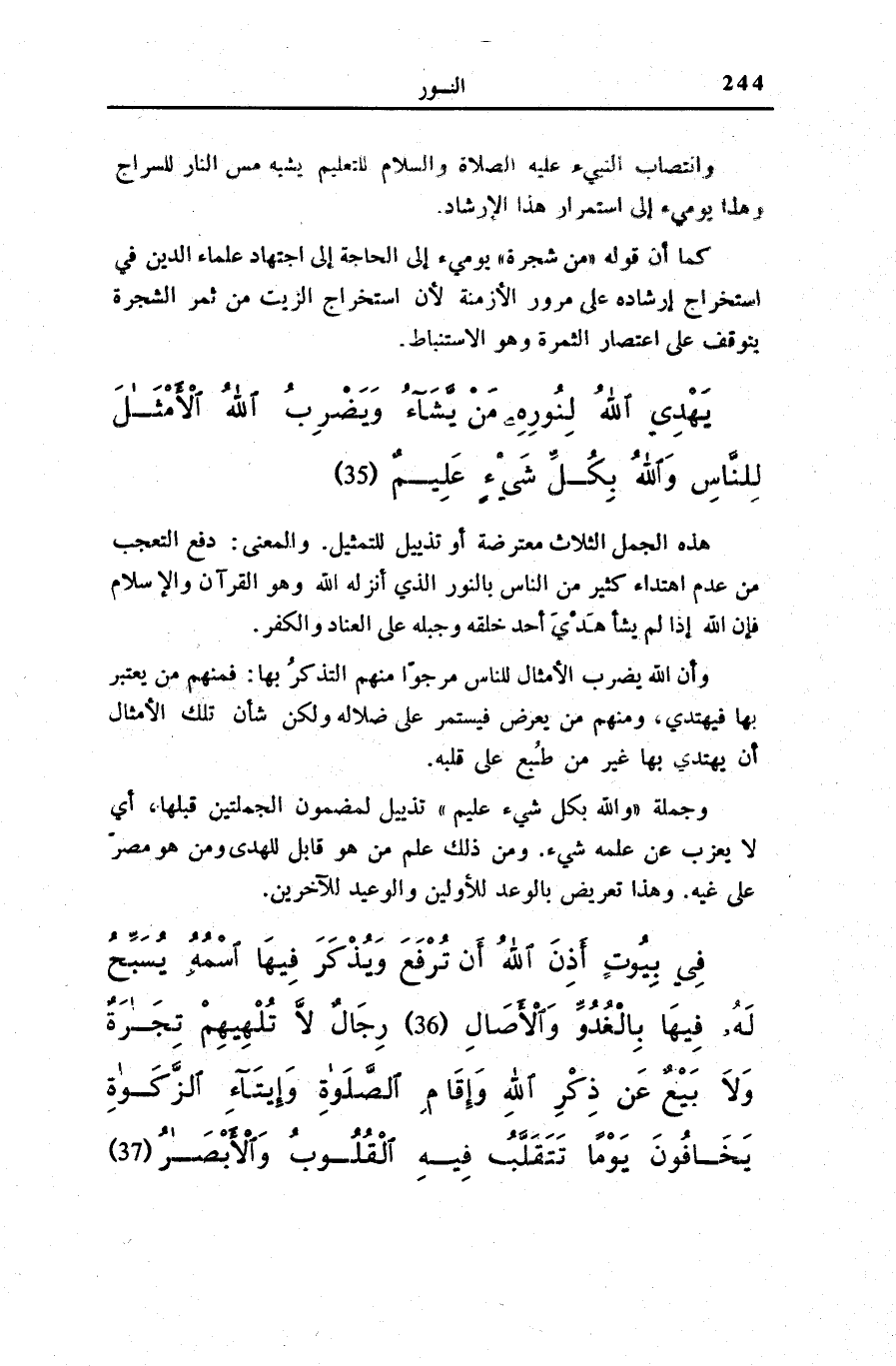 فِي بُيُوتٍ أَذِنَ اللَّهُ أَنْ تُرْفَعَ وَيُذْكَرَ فِيهَا اسْمُهُ يُسَبِّحُ لَهُ فِيها بِالْغُدُوِّ وَالْآصالِ (36) رِجالٌ لَا تُلْهِيهِمْ تِجارَةٌ وَلا بَيْعٌ عَنْ ذِكْرِ اللَّهِ وَإِقامِ الصَّلاةِ وَإِيتاءِ الزَّكاةِ يَخافُونَ يَوْماً تَتَقَلَّبُ فِيهِ الْقُلُوبُ وَالْأَبْصارُ (37) لِيَجْزِيَهُمُ اللَّهُ أَحْسَنَ مَا عَمِلُوا وَيَزِيدَهُمْ مِنْ فَضْلِهِ وَاللَّهُ يَرْزُقُ مَنْ يَشاءُ بِغَيْرِ حِسابٍ