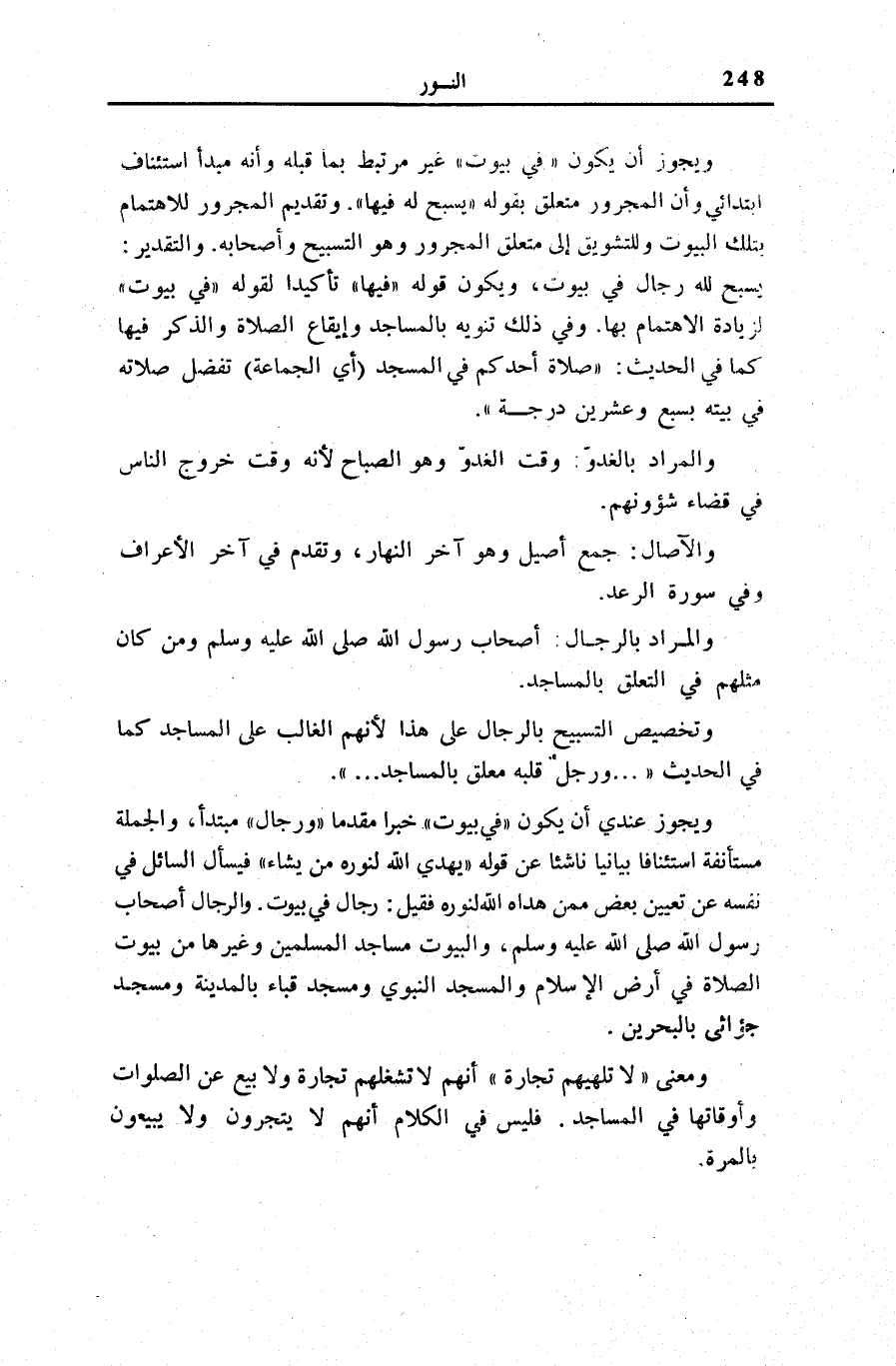 . وَيَجُوزُ عِنْدِي أَنْ يَكُونَ فِي بُيُوتٍ خَبَرًا مُقَدَّمًا ورِجالٌ مُبْتَدَأً، وَالْجُمْلَةُ مُسْتَأْنَفَةٌ اسْتِئْنَافًا بَيَانِيًّا نَاشِئًا عَنْ قَوْلِهِ: يَهْدِي اللَّهُ لِنُورِهِ مَنْ يَشاءُ [النُّور: 35] فَيَسْأَلُ السَّائِلُ فِي نَفْسِهِ عَنْ تَعْيِينِ بَعْضٍ مِمَّنْ هَدَاهُ اللَّهُ لِنُورِهِ فَقِيلَ: رِجَالٌ فِي بُيُوتٍ. وَالرِّجَالُ أَصْحَابُ رَسُول الله صَلَّى اللهُ عَلَيْهِ وَسَلَّمَ، وَالْبُيُوتُ مَسَاجِدُ الْمُسْلِمِينَ وَغَيْرُهَا مِنْ بُيُوتِ الصَّلَاةِ فِي أَرْضِ الْإِسْلَامِ وَالْمَسْجِدُ النَّبَوِيُّ وَمَسْجِدُ قِبَاءَ بِالْمَدِينَةِ وَمَسْجِدُ جُؤَاثَى بِالْبَحْرَيْنِ.