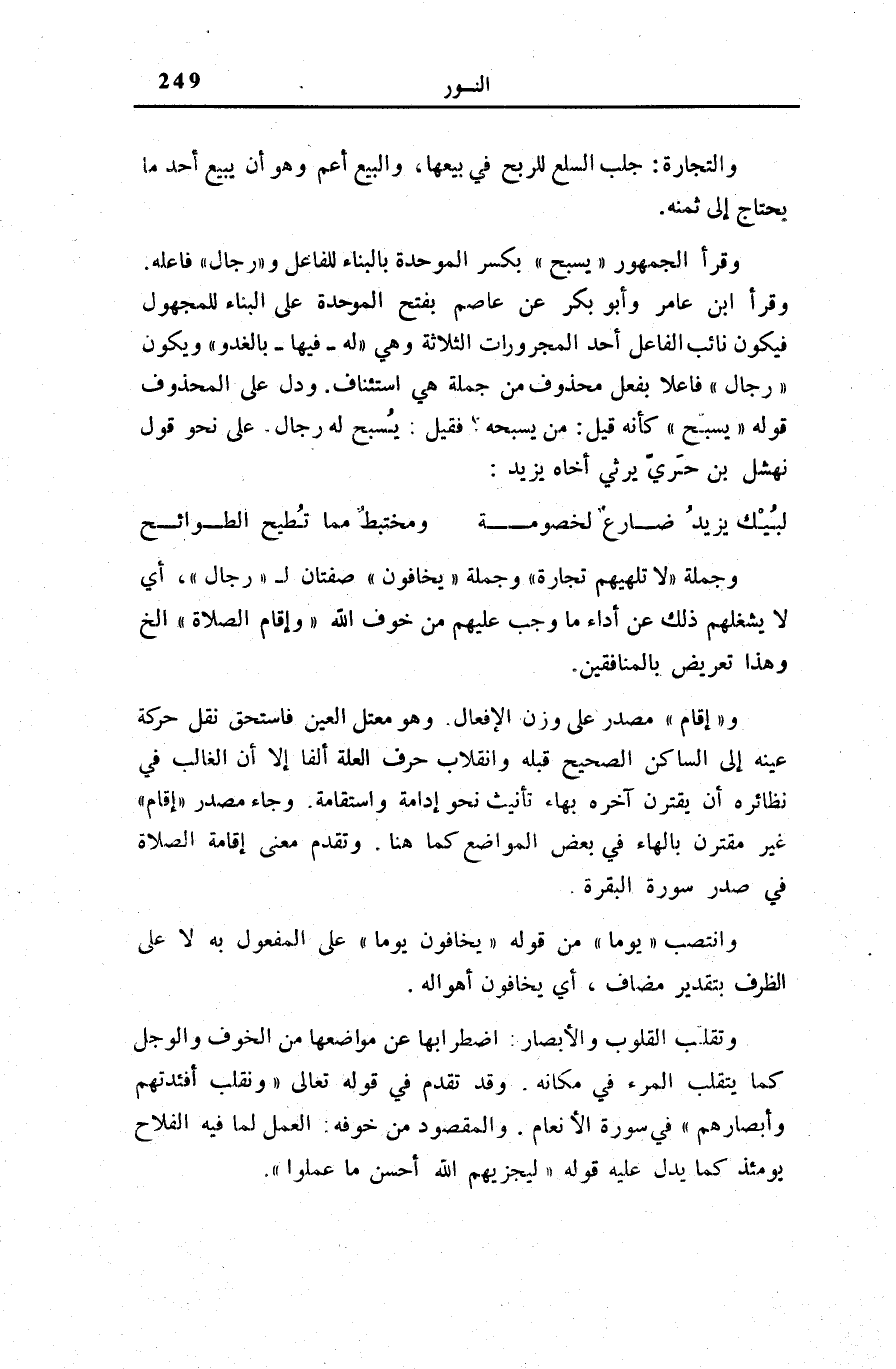وَقَرَأَ الْجُمْهُورُ: يُسَبِّحُ بِكَسْرِ الْمُوَحَّدَةِ بِالْبِنَاءِ لِلْفَاعِلِ ورِجالٌ فَاعِلُهُ. وَقَرَأَ ابْنُ عَامِرٍ وَأَبُو بَكْرٍ عَنْ عَاصِمٍ بِفَتْحِ الْمُوَحَّدَةِ عَلَى الْبِنَاءِ لِلْمَجْهُولِ فَيَكُونُ نَائِبُ الْفَاعِلِ أَحَدَ الْمَجْرُورَاتِ الثَّلَاثَةِ وَهِيَ لَهُ- فِيها- بِالْغُدُوِّ وَيَكُونُ رِجالٌ فَاعِلًا بِفِعْلٍ مَحْذُوفٍ مِنْ جُمْلَةٍ هِيَ اسْتِئْنَافٌ. وَدَلَّ عَلَى الْمَحْذُوفِ قَوْلُهُ: يُسَبِّحُ كَأَنَّهُ قِيلَ: مَنْ يُسَبِّحُهُ؟ فَقِيلَ: