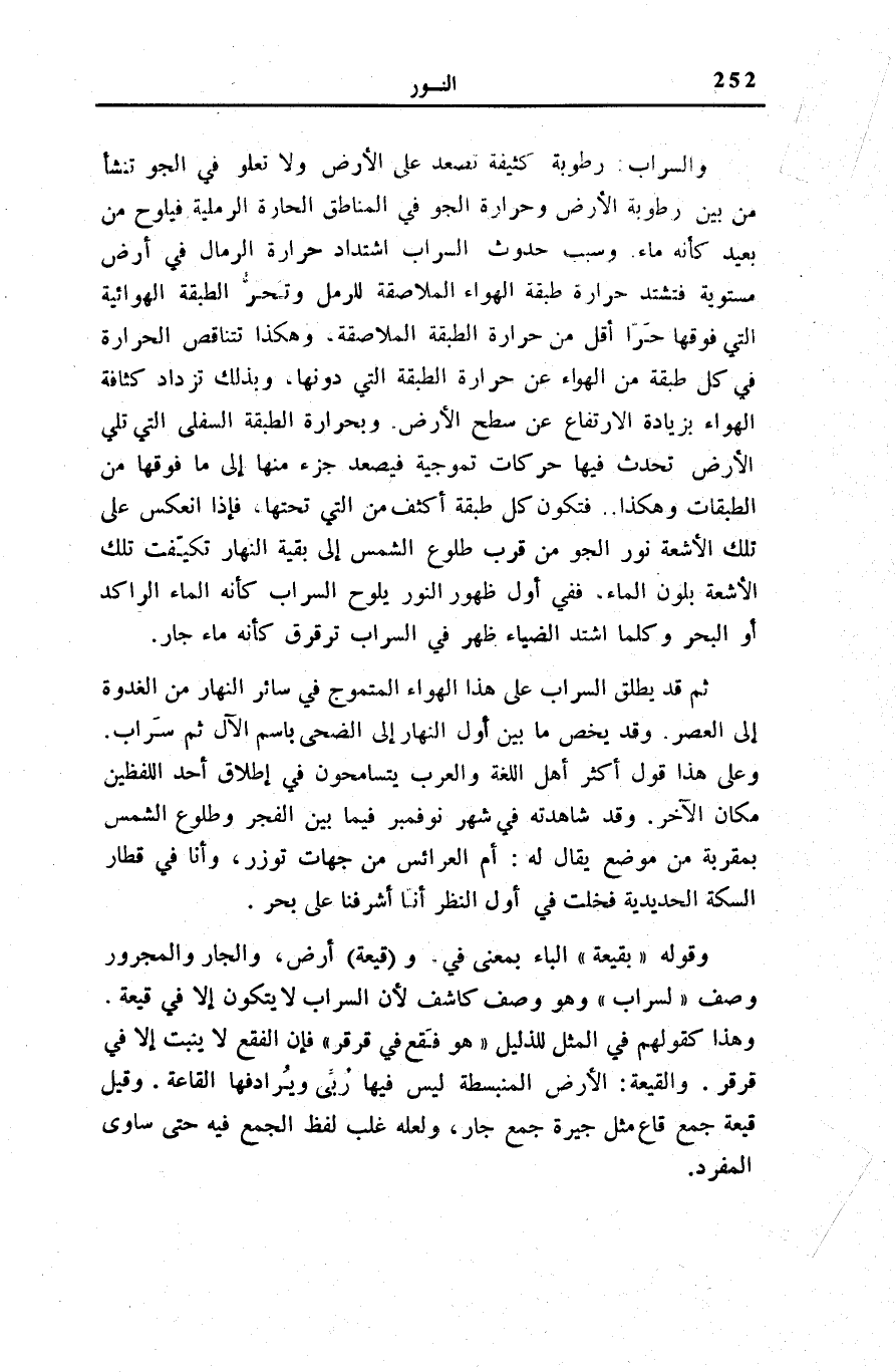 وَالسَّرَابُ: رُطُوبَةٌ كَثِيفَةٌ تَصْعَدُ عَلَى الْأَرْضِ وَلَا تَعْلُو فِي الْجَوِّ تَنْشَأُ مِنْ بَيْنِ رُطُوبَةِ الْأَرْضِ وَحَرَارَةِ الْجَوِّ فِي الْمَنَاطِقِ الْحَارَّةِ الرَّمْلِيَّةِ فَيَلُوحُ مِنْ بَعِيدٍ كَأَنَّهُ مَاءٌ. وَسَبَبُ حُدُوثِ السَّرَابِ اشْتِدَادُ حَرَارَةِ الرِّمَالِ فِي أَرْضٍ مُسْتَوِيَةٍ فَتَشْتَدُّ حَرَارَةُ طَبَقَةِ الْهَوَاءِ الْمُلَاصِقَةِ لِلرَّمْلِ وَتَحِرُّ الطَّبَقَةُ الْهَوَائِيَّةُ الَّتِي فَوْقَهَا حَرًّا أَقَلَّ مِنْ حَرَارَةِ الطَّبَقَةِ الْمُلَاصِقَةِ. وَهَكَذَا تَتَنَاقَصُ الْحَرَارَةُ فِي كُلِّ طَبَقَةٍ مِنَ الْهَوَاءِ عَنْ حَرَارَةِ الطَّبَقَةِ الَّتِي دُونَهَا. وَبِذَلِكَ تَزْدَادُ كَثَافَةُ الْهَوَاءِ بِزِيَادَةِ الِارْتِفَاعِ عَنْ سَطْحِ الْأَرْضِ. وَبِحَرَارَةِ الطَّبَقَةِ السُّفْلَى الَّتِي تَلِي الْأَرْضَ تَحْدُثُ فِيهَا
