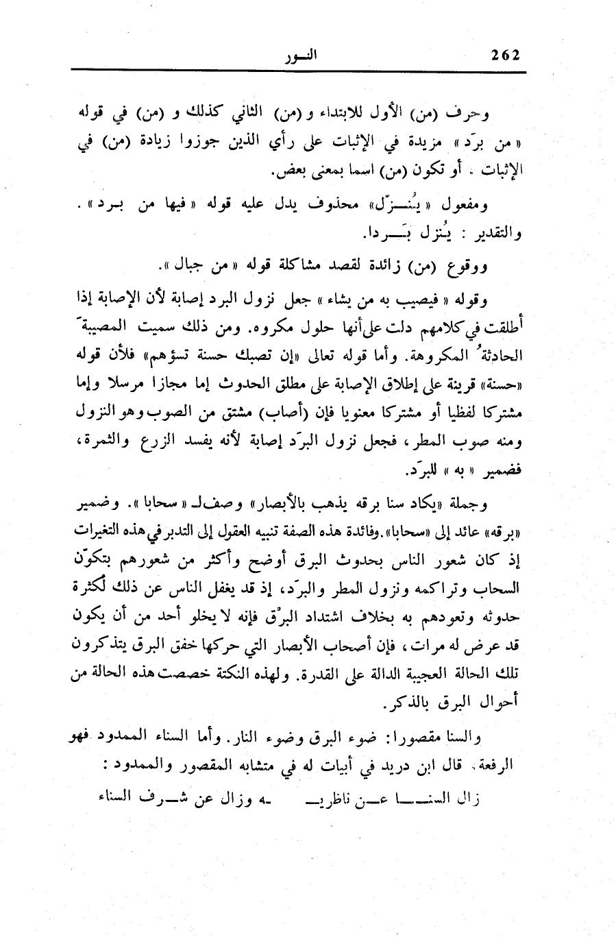 وَجُمْلَةُ: يَكادُ سَنا بَرْقِهِ يَذْهَبُ بِالْأَبْصارِ وَصْفٌ لِ سَحاباً. وَضَمِيرُ بَرْقِهِ عَائِدٌ إِلَى سَحاباً. وَفَائِدَةُ هَذِهِ الصِّفَةِ تَنْبِيهُ الْعُقُولِ إِلَى التَّدَبُّرِ فِي هَذِهِ التَّغَيُّرَاتِ إِذْ كَانَ شُعُورُ النَّاسِ بِحُدُوثِ الْبَرْقِ أَوْضَحَ وَأَكْثَرَ مِنْ شُعُورِهِمْ بِتَكَوُّنِ السَّحَابِ وَتَرَاكُمِهِ وَنُزُولِ الْمَطَرِ وَالْبَرَدِ، إِذْ قَدْ يَغْفَلُ النَّاسُ عَنْ ذَلِكَ لِكَثْرَةِ حُدُوثِهِ وَتَعَوُّدِهِمْ بِهِ بِخِلَافِ اشْتِدَادِ الْبَرْقِ فَإِنَّهُ لَا يَخْلُو أَحَدٌ مِنْ أَنْ يَكُونَ قَدْ عَرَضَ لَهُ مَرَّاتٍ، فَإِنَّ أَصْحَابَ الْأَبْصَارِ الَّتِي حَرَّكَهَا خَفْقُ الْبَرْقِ يَتَذَكَّرُونَ تِلْكَ الْحَالَةَ الْعَجِيبَةَ الدَّالَّةَ عَلَى الْقُدْرَةِ. وَلِهَذِهِ النُّكْتَةِ خُصِّصَتْ هَذِهِ الْحَالَةُ مِنْ أَحْوَالِ الْبَرْقِ بِالذِّكْرِ.