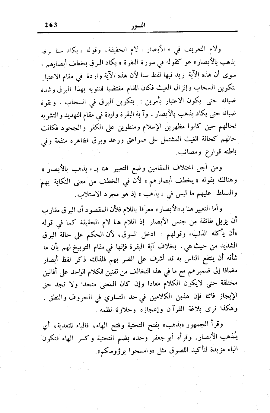 13] وَقَوْلُهُمْ: ادْخُلِ السُّوقَ، لِأَنَّ الْحُكْمَ عَلَى حَالَةِ الْبَرْقِ الشَّدِيدِ مِنْ حَيْثُ هِيَ. بِخِلَافِ آيَةِ الْبَقَرَةِ فَإِنَّهَا فِي مَقَامِ التَّوْبِيخِ لَهُمْ بِأَنَّ مَا شَأْنُهُ أَنْ يَنْتَفِعَ النَّاسُ بِهِ قَدْ أَشْرَفَ عَلَى الضُّرِّ بِهِمْ فَلِذَلِكَ ذَكَرَ لَفْظَ أَبْصَارٍ مُضَافًا إِلَى ضَمِيرِهِمْ مَعَ مَا فِي هَذَا التَّخَالُفِ مَنْ تَفْنَيْنِ الْكَلَامِ الْوَاحِدِ عَلَى أَفَانِينَ مُخْتَلِفَةٍ حَتَّى لَا يَكُونَ الْكَلَامُ مُعَادًا وَإِنْ كَانَ الْمَعْنَى مُتَّحِدًا وَلَا تَجِدُ حَقَّ الْإِيجَازِ فَائِتًا فَإِنَّ هَذَيْنِ الْكَلَامَيْنِ فِي حَدِّ التَّسَاوِي فِي الْحُرُوف وَالنُّطْقِ. وَهَكَذَا نَرَى بَلَاغَةَ الْقُرْآنِ وَإِعْجَازَهُ وَحَلَاوَةَ نَظْمِهِ.