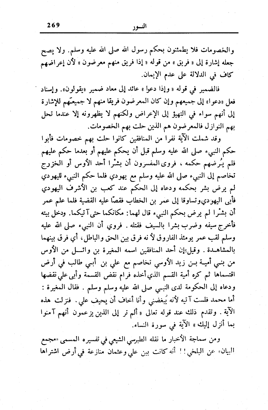 وَالْخُصُومَاتُ فَلَا يَطْمَئِنُّونَ بِحُكْمِ رَسُول الله صَلَّى اللهُ عَلَيْهِ وَسَلَّمَ. وَلَا يَصِحُّ جَعْلُهُ إِشَارَةً إِلَى فَرِيقٌ مِنْ قَوْلِهِ: إِذا فَرِيقٌ مِنْهُمْ مُعْرِضُونَ لِأَنَّ إِعْرَاضَهُمْ كَافٍ فِي الدَّلَالَةِ عَلَى عَدَمِ الْإِيمَانِ.