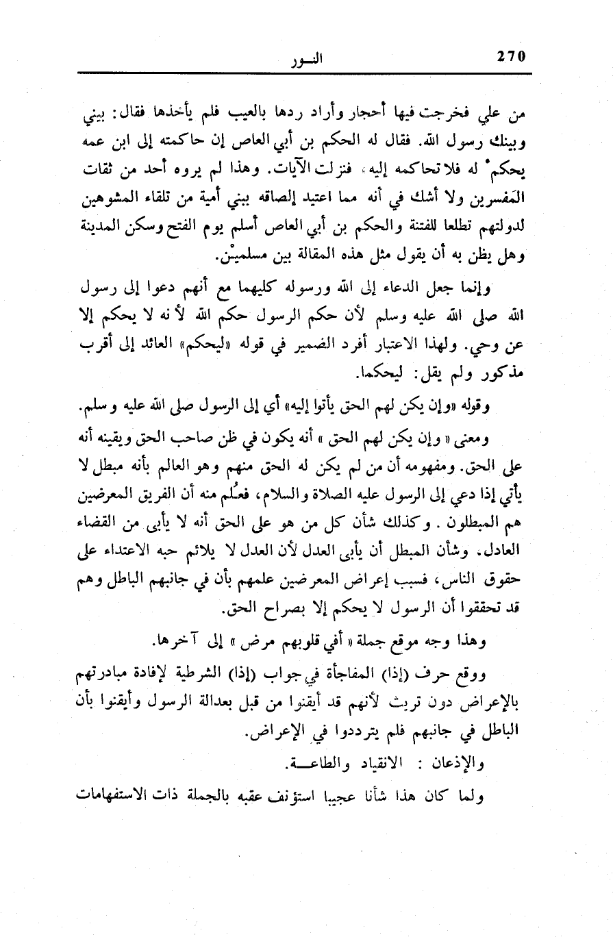 مِنْ عَلِيٍّ فَخَرَجَتْ فِيهَا أَحْجَارٌ وَأَرَادَ رَدَّهَا بِالْعَيْبِ فَلَمْ يَأْخُذْهَا فَقَالَ: بَيْنِي وَبَيْنَكَ رَسُولُ اللَّهِ. فَقَالَ لَهُ الْحَكَمُ بْنُ أَبِي الْعَاصِ إِنْ حَاكَمْتَهُ إِلَى ابْنِ عَمِّهِ يَحْكُمُ لَهُ فَلَا تُحَاكِمْهُ إِلَيْهِ. فَنَزَلَتِ الْآيَاتُ. وَهَذَا لَمْ يَرْوِهِ أَحَدٌ مِنْ ثِقَاتِ الْمُفَسِّرِينَ وَلَا أَشُكُّ فِي أَنَّهُ مِمَّا اعْتِيدَ إِلْصَاقُهُ بِبَنِي أُمَيَّةَ مِنْ تِلْقَاءِ الْمُشَوِّهِينَ لِدَوْلَتِهِمْ تَطَلُّعًا لِلْفِتْنَةِ، وَالْحَكَمُ بْنُ أَبِي الْعَاصِ أَسْلَمَ يَوْمَ الْفَتْحِ وَسَكَنَ الْمَدِينَةَ وَهَلْ يُظَنُّ بِهِ أَنْ يَقُولَ مِثْلَ هَذِهِ الْمَقَالَةِ بَيْنَ مُسْلِمِينَ.