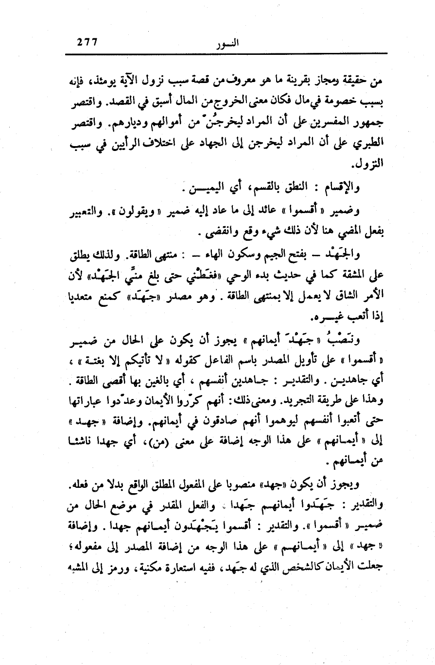 وَالتَّقْدِيرُ: جَاهِدِينَ أَنْفُسَهُمْ، أَيْ بَالِغِينَ بِهَا أَقْصَى الطَّاقَةِ وَهَذَا عَلَى طَرِيقَةِ التَّجْرِيدِ. وَمَعْنَى ذَلِكَ: أَنَّهُمْ كَرَّرُوا الْأَيْمَانَ وَعَدَّدُوا عِبَارَاتِهَا حَتَّى أَتْعَبُوا أَنْفُسَهُمْ لِيُوهِمُوا أَنَّهُمْ صَادِقُونَ فِي أَيْمَانِهِمْ. وَإِضَافَةُ جَهْدَ