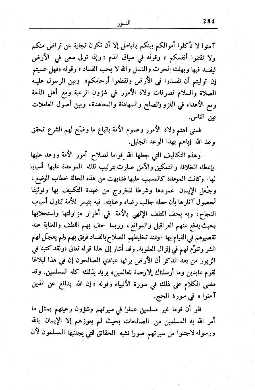 وَهَذِهِ التَّكَالِيفُ الَّتِي جعلهَا الله قواما لِصَلَاحِ أُمُورِ الْأُمَّةِ وَوَعَدَ عَلَيْهَا بِإِعْطَاءِ الْخِلَافَةِ وَالتَّمْكِينِ وَالْأَمْنِ صَارَتْ بِتَرْتِيبِ تِلْكَ الْمَوْعِدَةِ عَلَيْهَا أَسْبَابًا لَهَا. وَكَانَتِ الْمَوْعِدَةُ كَالْمُسَبَّبِ عَلَيْهَا فَشَابَهَتْ مِنْ هَذِهِ الْحَالَةِ خِطَابَ الْوَضْعِ، وَجُعِلَ الْإِيمَانُ عَمُودَهَا وَشَرْطًا لِلْخُرُوجِ مِنْ عُهْدَةِ التَّكْلِيفِ بِهَا وَتَوْثِيقًا لِحُصُولِ آثَارِهَا بِأَنْ جَعَلَهُ جَالِبَ رِضَاهُ وَعِنَايَتِهِ. فَبِهِ يَتَيَسَّرُ لِلْأُمَّةِ تَنَاوُلُ أَسْبَابِ النَّجَاحِ، وَبِهِ يَحُفُّ اللُّطْفُ الْإِلَهِيُّ بِالْأُمَّةِ فِي أَطْوَارِ مُزَاوَلَتِهَا وَاسْتِجْلَابِهَا بِحَيْثُ يَدْفَعُ عَنْهُمُ الْعَرَاقِيلَ وَالْمَوَانِعَ، وَرُبَّمَا حَفَّ بِهِمُ اللُّطْفُ وَالْعِنَايَةُ عِنْدَ تَقْصِيرِهِمْ فِي الْقِيَامِ بِهَا. وَعِنْدَ تَخْلِيطِهِمُ الصَّلَاحَ بِالْفَسَادِ فَرَفَقَ بِهِمْ وَلَمْ يُعَجِّلْ لَهُمُ الشَّرَّ وَتَلَوَّمَ لَهُمْ فِي إِنْزَالِ الْعُقُوبَةِ. وَقَدْ أَشَارَ إِلَى هَذَا قَوْلِهِ تَعَالَى: وَلَقَدْ كَتَبْنا فِي الزَّبُورِ مِنْ بَعْدِ الذِّكْرِ أَنَّ الْأَرْضَ يَرِثُها عِبادِيَ الصَّالِحُونَ إِنَّ فِي هَذَا لَبَلاغاً لِقَوْمٍ عابِدِينَ وَما أَرْسَلْناكَ إِلَّا رَحْمَةً لِلْعالَمِينَ [الْأَنْبِيَاء: 105- 107] يُرِيدُ بِذَلِكَ كُلِّهِ الْمُسْلِمِينَ. وَقَدْ مَضَى الْكَلَامُ عَلَى ذَلِكَ فِي سُورَة الْأَنْبِيَاء وَقَوله: إِنَّ اللَّهَ يُدافِعُ عَنِ الَّذِينَ آمَنُوا فِي سُورَةِ الْحَجِّ [38] .