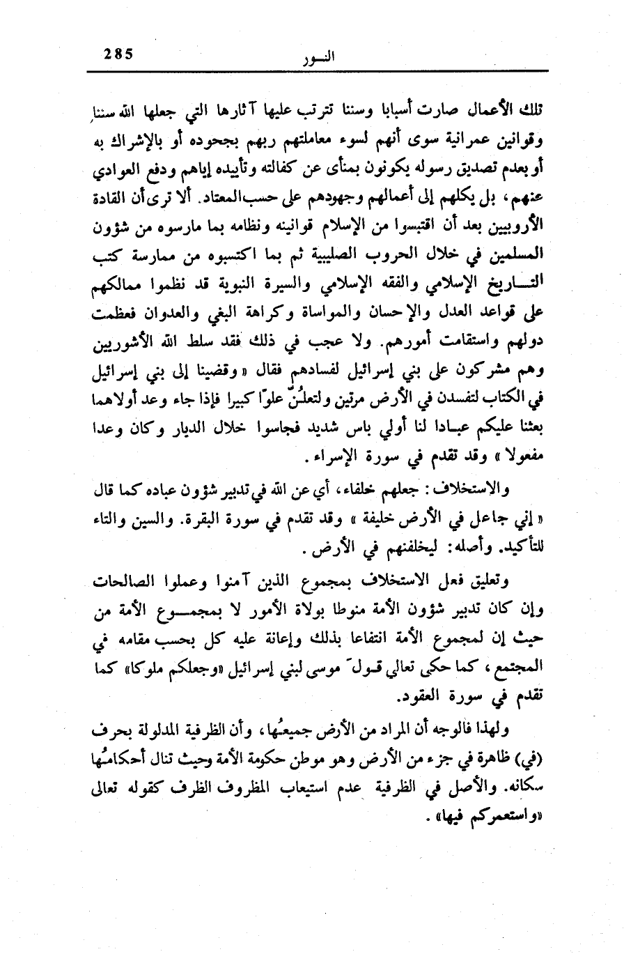 وَتَعْلِيقُ فِعْلِ الِاسْتِخْلَافِ بِمَجْمُوعِ الَّذِينَ آمَنُوا وَعَمِلُوا الصَّالِحَاتِ وَإِنْ كَانَ تَدْبِير شؤون الْأُمَّةِ مَنُوطًا بِوُلَاةِ الْأُمُورِ لَا بِمَجْمُوعِ الْأُمَّةِ مِنْ حَيْثُ إِنَّ لِمَجْمُوعِ الْأُمَّةِ انْتِفَاعًا بِذَلِكَ وَإِعَانَةً عَلَيْهِ كُلٌّ بِحَسَبِ مَقَامِهِ فِي الْمُجْتَمَعِ، كَمَا حَكَى تَعَالَى قَوْلَ مُوسَى لِبَنِي إِسْرَائِيلَ: