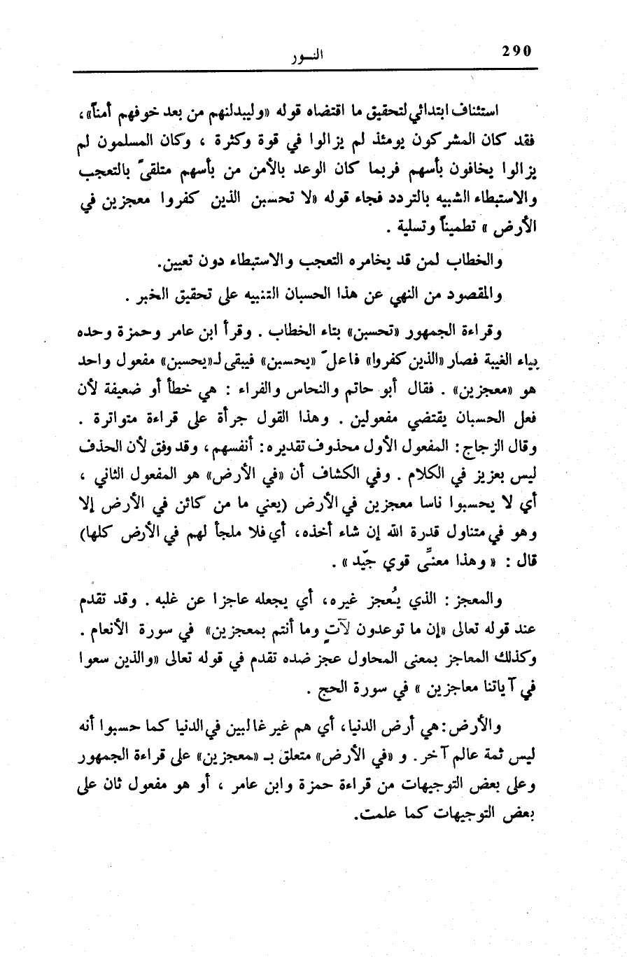 أَنْفُسَهُمْ، وَقَدْ وُفِّقَ لِأَنَّ الْحَذْفَ لَيْسَ بِعَزِيزٍ فِي الْكَلَامِ. وَفِي «الْكَشَّافِ» أَنْ فِي الْأَرْضِ هُوَ الْمَفْعُولُ الثَّانِي، أَيْ لَا يَحْسَبُوا نَاسًا مُعْجِزِينَ فِي الْأَرْضِ (يَعْنِي مَا مِنْ كَائِنٍ فِي الْأَرْضِ إِلَّا وَهُوَ فِي مُتَنَاوَلِ قُدْرَةِ اللَّهِ إِنْ شَاءَ أَخَذَهُ، أَيْ فَلَا مَلْجَأَ لَهُمْ فِي الْأَرْضِ كُلِّهَا) قَالَ: «وَهَذَا مَعْنًى قَوِيٌّ جَيِّدٌ» .