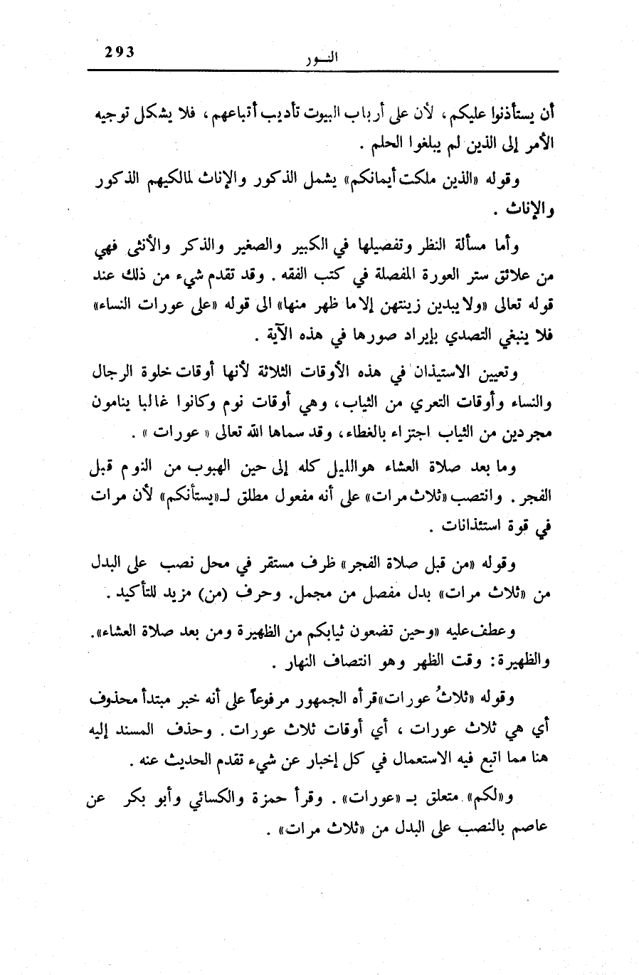 وَأَمَّا مَسْأَلَةُ النَّظَرِ وَتَفْصِيلُهَا فِي الْكَبِيرِ وَالصَّغِيرِ وَالذَّكَرِ وَالْأُنْثَى فَهِيَ مِنْ عَلَائِقِ سَتْرِ الْعَوْرَةِ الْمُفَصَّلَةِ فِي كُتُبِ الْفِقْهِ. وَقَدْ تَقَدَّمَ شَيْءٌ مِنْ ذَلِكَ عِنْدَ قَوْلِهِ تَعَالَى: وَلا يُبْدِينَ زِينَتَهُنَّ إِلَّا مَا ظَهَرَ مِنْها إِلَى قَوْلِهِ: عَلى عَوْراتِ النِّساءِ [النُّور: 31] فَلَا يَنْبَغِي التَّصَدِّي بِإِيرَادِ صُوَرِهَا فِي هَذِهِ الْآيَة.