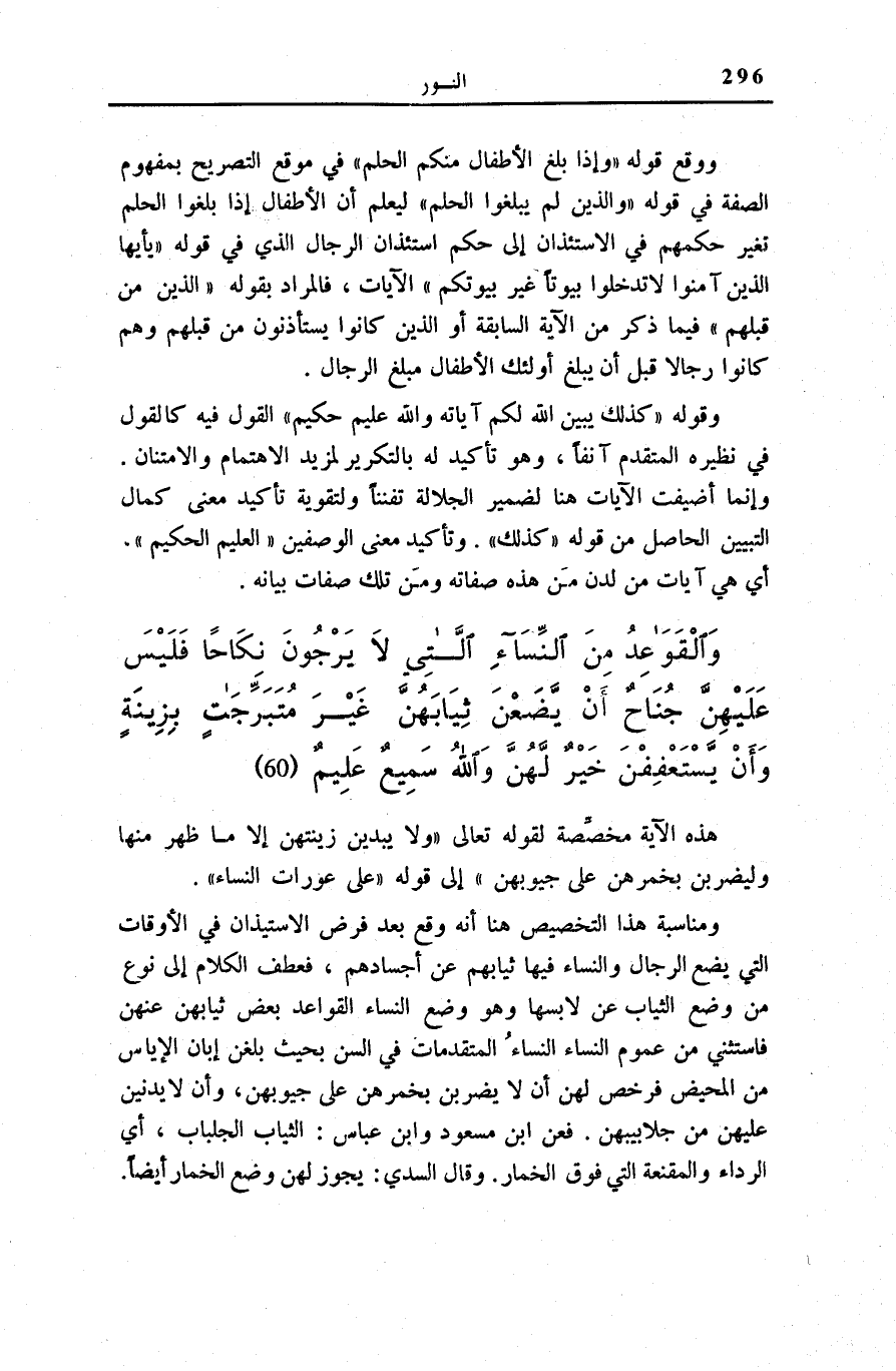 وَالْقَواعِدُ مِنَ النِّساءِ اللاَّتِي لَا يَرْجُونَ نِكاحاً فَلَيْسَ عَلَيْهِنَّ جُناحٌ أَنْ يَضَعْنَ ثِيابَهُنَّ غَيْرَ مُتَبَرِّجاتٍ بِزِينَةٍ وَأَنْ يَسْتَعْفِفْنَ خَيْرٌ لَهُنَّ وَاللَّهُ سَمِيعٌ عَلِيمٌ (60)