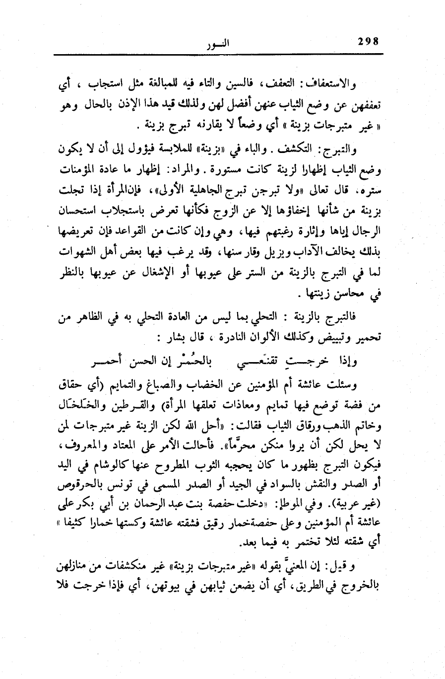 فَأَحَالَتِ الْأَمْرَ عَلَى الْمُعْتَادِ وَالْمَعْرُوفِ، فَيَكُونُ التَّبَرُّجُ بِظُهُورِ مَا كَانَ يَحْجِبُهُ الثَّوْبُ الْمَطْرُوحُ عَنْهَا كَالْوِشَامِ فِي الْيَدِ أَوِ الصَّدْرِ وَالنَّقْشِ بِالسَّوَادِ فِي الْجِيدِ أَوِ الصَّدْرِ الْمُسَمَّى فِي تُونُسَ بِالْحُرْقُوصِ (غَيْرِ عَرَبِيَّةٍ) . وَفِي «الْمُوَطَّأِ» : «دَخَلَتْ حَفْصَةُ بِنْتُ عَبْدِ الرَّحْمَنِ بْنِ أَبِي بَكْرٍ عَلَى عَائِشَةَ أُمِّ الْمُؤْمِنِينَ وَعَلَى حَفْصَةَ خِمَارٌ رَقِيقٌ فَشَقَّتْهُ عَائِشَةُ وَكَسَتْهَا خِمَارًا كَثِيفًا» أَيْ شقته لِئَلَّا تختمر بِهِ فِيمَا بَعْدُ.