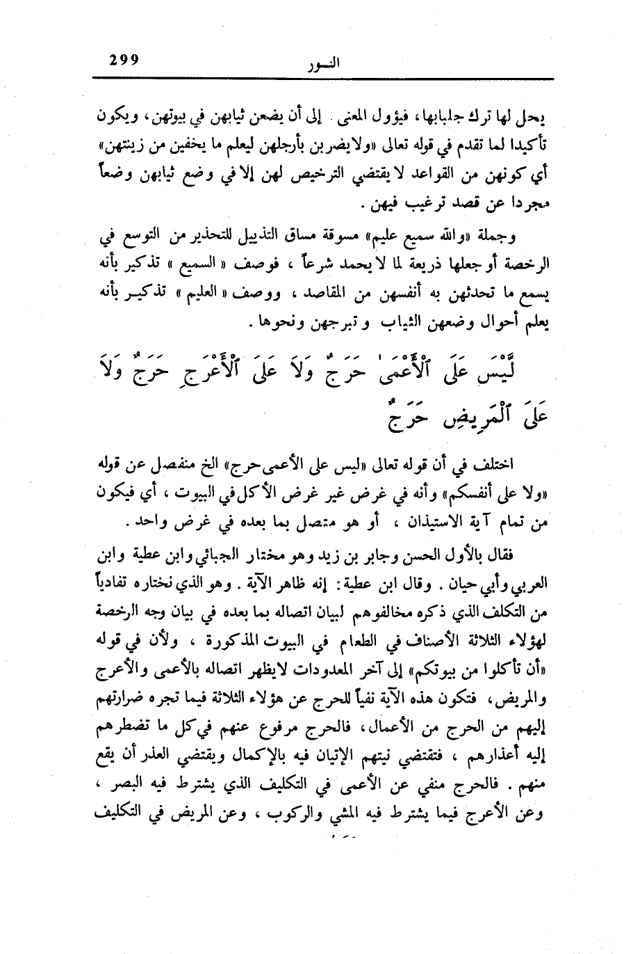 فَقَالَ بِالْأَوَّلِ الْحَسَنُ وَجَابِرُ بْنُ زَيْدٍ وَهُوَ مُخْتَارٌ الْجِبَائِيُّ وَابْنُ عَطِيَّةَ وَابْنُ الْعَرَبِيِّ وَأَبِي حَيَّانَ. وَقَالَ ابْنُ عَطِيَّةَ: إِنَّهُ ظَاهِرُ الْآيَةِ. وَهُوَ الَّذِي نَخْتَارُهُ تَفَادِيًا مِنَ التَّكَلُّفِ الَّذِي ذَكَرَهُ مُخَالِفُوهُمْ لِبَيَانِ اتِّصَالِهِ بِمَا بَعْدَهُ فِي بَيَانِ وَجْهِ الرُّخْصَةِ لِهَؤُلَاءِ الثَّلَاثَةِ الْأَصْنَافِ فِي الطَّعَامِ فِي الْبُيُوتِ الْمَذْكُورَةِ، وَلِأَنَّ فِي قَوْلِهِ: أَنْ تَأْكُلُوا مِنْ بُيُوتِكُمْ إِلَى آخِرِ الْمَعْدُودَاتِ لَا يَظْهَرُ اتِّصَالُهُ بِالْأَعْمَى وَالْأَعْرَجِ وَالْمَرِيضِ، فَتَكُونُ هَذِهِ الْآيَةُ نَفْيًا لِلْحَرَجِ عَنْ هَؤُلَاءِ الثَّلَاثَةِ فِيمَا تَجُرُّهُ ضِرَارَتُهُمْ إِلَيْهِمْ مِنَ الْحَرَجِ مِنَ الْأَعْمَالِ، فَالْحَرَجُ مَرْفُوعٌ عَنْهُمْ فِي كُلِّ مَا تَضْطَرُّهُمْ إِلَيْهِ أَعْذَارُهُمْ، فَتَقْتَضِي نِيَّتُهُمْ الْإِتْيَانَ فِيهِ بِالْإِكْمَالِ وَيَقْتَضِي الْعُذْرُ أَنْ يَقَعَ مِنْهُمْ.
