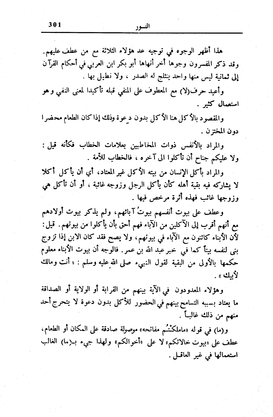 وَعَطَفَ عَلَى بُيُوتِ أَنْفُسِهِمْ بُيُوتَ آبَائِهِمْ، وَلَمْ يَذْكُرْ بُيُوتَ أَوْلَادِهِمْ مَعَ أَنَّهُمْ أَقْرَبُ إِلَى الْآكِلِينَ مِنَ الْآبَاءِ فَهُمْ أَحَقُّ بِأَنْ يَأْكُلُوا مِنْ بُيُوتِهِمْ. قِيلَ: لِأَنَّ الْأَبْنَاءَ كَائِنُونَ مَعَ الْآبَاءِ فِي بُيُوتِهِمْ، وَلَا يَصِحُّ، فَقَدْ كَانَ الِابْنُ إِذَا تَزَوَّجَ بَنَى لِنَفْسِهِ بَيْتًا كَمَا فِي خَبَرِ عَبْدِ اللَّهِ بْنِ عُمَرَ. فَالْوَجْهُ أَنَّ بُيُوتَ الْأَبْنَاءِ مَعْلُومٌ حُكْمُهَا بِالْأَوْلَى مِنَ الْبَقِيَّةِ