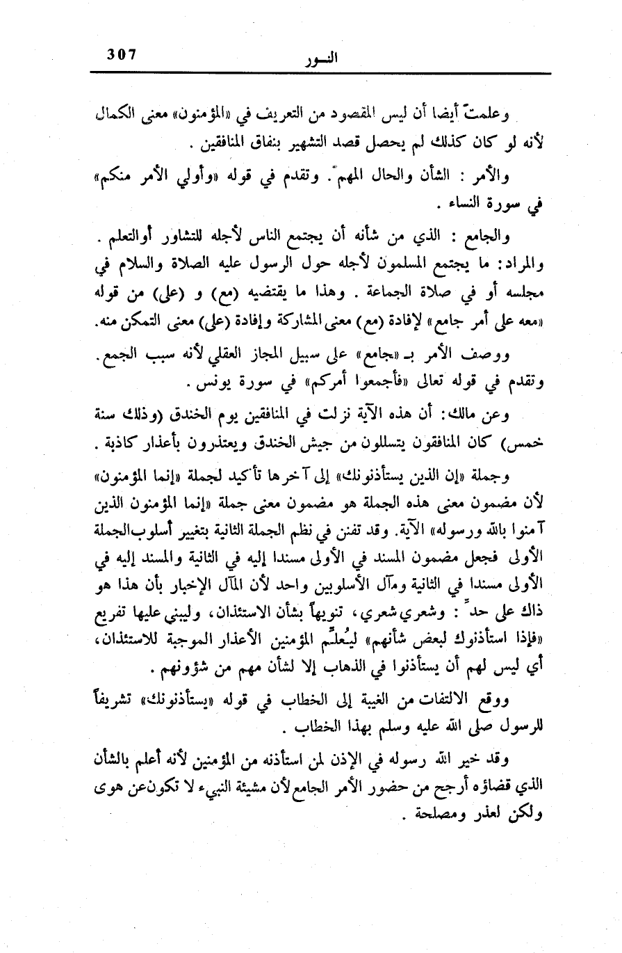 وَجُمْلَةُ: إِنَّ الَّذِينَ يَسْتَأْذِنُونَكَ إِلَى آخِرِهَا تَأْكِيدٌ لِجُمْلَةِ: إِنَّمَا الْمُؤْمِنُونَ لِأَنَّ مَضْمُونَ مَعْنَى هَذِهِ الْجُمْلَةِ هُوَ مَضْمُونُ مَعْنَى جُمْلَةِ: إِنَّمَا الْمُؤْمِنُونَ الَّذِينَ آمَنُوا بِاللَّهِ وَرَسُولِهِ الْآيَةَ. وَقَدْ تَفَنَّنَ فِي نَظْمِ الْجُمْلَةِ الثَّانِيَةِ بِتَغْيِيرِ أُسْلُوبِ الْجُمْلَةِ الْأُولَى فَجَعَلَ مَضْمُونَ الْمُسْنَدِ فِي الْأُولَى مُسْنَدًا إِلَيْهِ فِي الثَّانِيَةِ وَالْمَسْنَدَ إِلَيْهِ فِي الْأُولَى مُسْنَدًا فِي الثَّانِيَةِ وَمَآلُ الْأُسْلُوبَيْنِ وَاحِدٌ لِأَنَّ الْمَآلَ الْإِخْبَارُ بِأَنَّ هَذَا هُوَ ذَاكَ عَلَى حَدِّ: وَشِعْرِي شِعْرِي، تَنْوِيهًا بِشَأْنِ الِاسْتِئْذَانِ، وَلِيُبْنَى عَلَيْهَا تَفْرِيعٌ فَإِذَا اسْتَأْذَنُوكَ لِبَعْضِ شَأْنِهِمْ لِيُعَلِّمَ الْمُؤْمِنِينَ الْأَعْذَارَ الْمُوجِبَةَ لِلِاسْتِئْذَانِ، أَيْ لَيْسَ لَهُمْ أَنْ يَسْتَأْذِنُوا فِي الذَّهَابِ إِلَّا لِشَأْنٍ مُهِمّ من شؤونهم.
