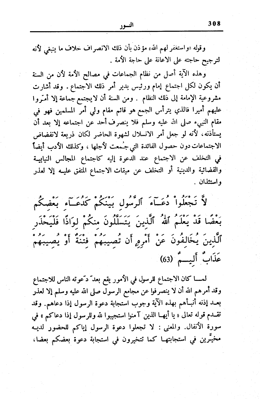 وَهَذِهِ الْآيَةُ أَصْلٌ مِنْ نِظَامِ الْجَمَاعَاتِ فِي مَصَالِحِ الْأُمَّةِ لِأَنَّ مِنَ السُّنَّةِ أَنْ يَكُونَ لِكُلِّ اجْتِمَاعٍ إِمَامٌ وَرَئِيسٌ يُدِيرُ أَمْرَ ذَلِكَ الِاجْتِمَاعِ. وَقَدْ أَشَارَتْ مَشْرُوعِيَّةُ الْإِمَامَةِ إِلَى ذَلِكَ النِّظَامِ. وَمِنَ السُّنَّةِ أَنْ لَا يَجْتَمِعَ جَمَاعَةٌ إِلَّا أَمَّرُوا عَلَيْهِمْ أَمِيرًا فَالَّذِي يَتَرَأَّسُ الْجَمْعَ هُوَ قَائِمٌ مَقَامَ وَلِيِّ أَمْرِ الْمُسْلِمِينَ فَهُوَ فِي مقَام النبيء صَلَّى اللهُ عَلَيْهِ وَسَلَّمَ فَلَا يَنْصَرِفُ أَحَدٌ عَنِ اجْتِمَاعِهِ إِلَّا بَعْدَ أَنْ يَسْتَأْذِنَهُ، لِأَنَّهُ لَوْ جَعَلَ أَمْرَ الِانْسِلَالِ لِشَهْوَةِ الْحَاضِرِ لَكَانَ ذَرِيعَةً لِانْفِضَاضِ الِاجْتِمَاعَاتِ دُونَ حُصُولِ الْفَائِدَةِ الَّتِي جُمِعَتْ لِأَجْلِهَا، وَكَذَلِكَ الْأَدَبُ أَيْضًا فِي التَّخَلُّفِ عَنِ الِاجْتِمَاعِ عِنْدَ الدَّعْوَةِ إِلَيْهِ كَاجْتِمَاعِ الْمَجَالِسِ النِّيَابِيَّةِ وَالْقَضَائِيَّةِ وَالدِّينِيَّةِ أَوِ التَّخَلُّفِ عَنْ مِيقَاتِ الِاجْتِمَاعِ الْمُتَّفَقِ عَلَيْهِ إِلَّا لعذر واستئذان.
