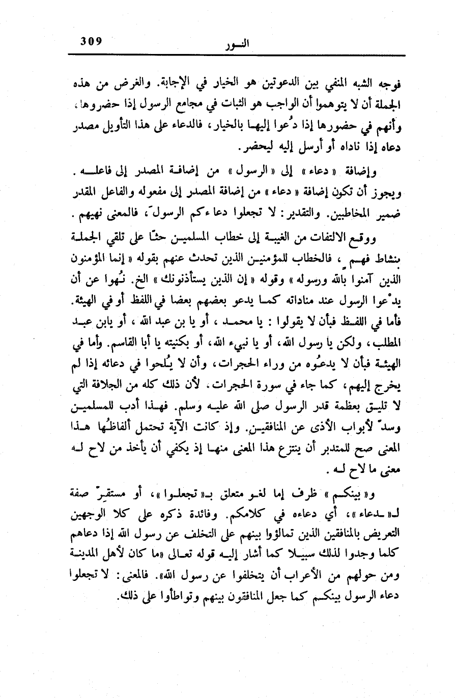 مُنَادَاتِهِ كَمَا يَدْعُو بَعْضُهُمْ بَعْضًا فِي اللَّفْظِ أَوْ فِي الْهَيْئَةِ. فَأَمَّا فِي اللَّفْظِ فَبِأَنْ لَا يَقُولُوا: يَا مُحَمَّدُ، أَوْ يَا ابْنَ عَبْدِ اللَّهِ، أَوْ يَا ابْنَ عَبْدِ الْمُطَّلِبِ، وَلَكِنْ يَا رَسُولَ اللَّهِ، أَوْ يَا نَبِيءَ الله، أَو بكنيته يَا أَبَا الْقَاسِمِ. وَأَمَّا فِي الْهَيْئَةِ فَبِأَنْ لَا يَدْعُوهُ مِنْ وَرَاءِ الْحُجُرَاتِ، وَأَنْ لَا يُلِحُّوا فِي دُعَائِهِ إِذَا لَمْ يَخْرُجْ إِلَيْهِمْ، كَمَا جَاءَ فِي سُورَةِ الْحُجُرَاتِ. لِأَنَّ ذَلِكَ كُلَّهُ مِنَ الْجَلَافَةِ الَّتِي لَا تَلِيقُ بِعَظَمَةِ قدر الرَّسُول صَلَّى اللهُ عَلَيْهِ وَسَلَّمَ. فَهَذَا أَدَبٌ لِلْمُسْلِمِينَ وَسَدٌّ لِأَبْوَابِ الْأَذَى عَنِ الْمُنَافِقين. وَإِذ كَانَتِ الْآيَةُ تَحْتَمِلُ أَلْفَاظُهَا هَذَا الْمَعْنَى صَحَّ لِلْمُتَدَبِّرِ أَنْ يَنْتَزِعَ هَذَا الْمَعْنَى مِنْهَا إِذْ يَكْفِي أَنْ يَأْخُذَ مَنْ لَاحَ لَهُ مَعْنَى مَا لَاحَ لَهُ.