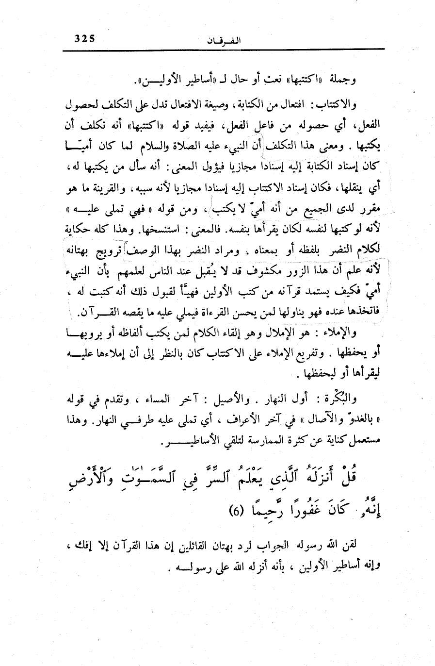 وَالْبُكْرَةُ: أَوَّلُ النَّهَارِ. وَالْأَصِيلُ: آخِرُ الْمَسَاءِ، وَتَقَدَّمَ فِي قَوْلِهِ: بِالْغُدُوِّ وَالْآصالِ فِي آخِرِ الْأَعْرَافِ [205] ، أَيْ تُمْلَى عَلَيْهِ طَرَفَيِ النَّهَارِ. وَهَذَا مُسْتَعْمَلٌ كِنَايَةً عَنْ كَثْرَةِ الْمُمَارَسَةِ لتلقي الأساطير.