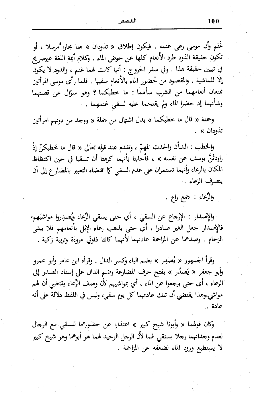 غَنَمٍ وَأَنَّ مُوسَى رَعَى غَنَمَهُ. فَيَكُونُ إِطْلَاقُ تَذُودانِ هُنَا مَجَازًا مُرْسَلًا، أَوْ تَكُونُ حَقِيقَةُ الذَّوْدِ طَرْدُ الْأَنْعَامِ كُلِّهَا عَنْ حَوْضِ الْمَاءِ. وَكَلَامُ أَيِمَّةِ اللُّغَةِ غَيْرُ صَرِيحٍ فِي تَبْيِينِ حَقِيقَةِ هَذَا. وَفِي سِفْرِ الْخُرُوجِ: أَنَّهَا كَانَتْ لَهُمَا غَنَمٌ، وَالذَّوْدُ لَا يَكُونُ إِلَّا لِلْمَاشِيَةِ. وَالْمَقْصُودُ مِنْ حُضُورِ