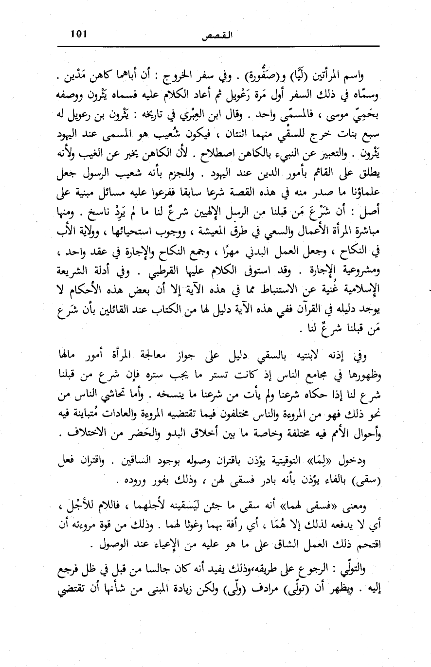 وَمِنْهَا مُبَاشَرَةُ الْمَرْأَةِ الْأَعْمَالَ وَالسَّعْيُ فِي طُرُقِ الْمَعِيشَةِ، وَوُجُوبُ اسْتِحْيَائِهَا، وَوِلَايَةُ الْأَبِ فِي النِّكَاحِ، وَجَعْلُ الْعَمَلِ الْبَدَنِيِّ مَهْرًا، وَجَمْعُ النِّكَاحِ وَالْإِجَارَةِ فِي عَقْدٍ وَاحِدٍ، وَمَشْرُوعِيَّةُ الْإِجَارَةِ. وَقَدِ اسْتَوْفَى الْكَلَامَ عَلَيْهَا الْقُرْطُبِيُّ. وَفِي أَدِلَّةِ الشَّرِيعَةِ الْإِسْلَامِيَّةِ غُنْيَةٌ عَنِ الِاسْتِنْبَاطِ مِمَّا فِي هَذِهِ الْآيَةِ إِلَّا أَنَّ بَعْضَ هَذِهِ الْأَحْكَامِ لَا يُوجَدُ دَلِيلُهُ فِي الْقُرْآنِ فَفِي هَذِهِ الْآيَةِ دَلِيلٌ لَهَا مِنَ الْكِتَابِ عِنْدَ الْقَائِلِينَ بِأَنَّ شَرْعَ مَنْ قَبْلَنَا شَرْعٌ لَنَا.