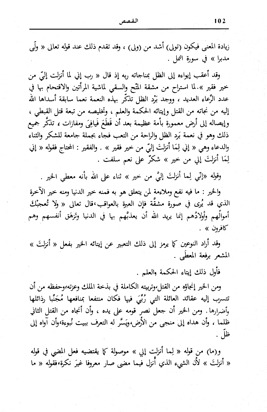 وَقَدْ أَعْقَبَ إِيوَاءَهُ إِلَى الظِّلِّ بِمُنَاجَاتِهِ رَبَّهُ إِذْ قَالَ رَبِّ إِنِّي لِما أَنْزَلْتَ إِلَيَّ مِنْ خَيْرٍ فَقِيرٌ. لَمَّا اسْتَرَاحَ مِنْ مَشَقَّةِ الْمَتْحِ وَالسَّقْيِ لِمَاشِيَةِ الْمَرْأَتَيْنِ وَالِاقْتِحَامِ بِهَا فِي عَدَدِ الرِّعَاءِ الْعَدِيدِ، وَوَجَدَ بَرْدَ الظِّلِّ تَذَكَّرَ بِهَذِهِ النِّعْمَةِ نِعَمًا سَابِقَةً أَسْدَاهَا اللَّهُ إِلَيْهِ مِنْ نَجَاتِهِ مِنَ الْقَتْلِ وَإِيتَائِهِ الْحِكْمَةَ وَالْعِلْمَ، وَتَخْلِيصِهِ مِنْ تَبِعَةِ قَتْلِ الْقِبْطِيِّ، وَإِيصَالِهِ إِلَى أَرْضٍ مَعْمُورَةٍ بِأُمَّةٍ عَظِيمَةٍ بَعْدَ أَنْ قَطَعَ فَيَافِيَ وَمُفَازَاتٍ، تَذَكَّرَ جَمِيعَ ذَلِكَ وَهُوَ فِي نِعْمَةِ بَرْدِ الظِّلِّ وَالرَّاحَةِ مِنَ التَّعَبِ فَجَاءَ بِجُمْلَةٍ جَامِعَةٍ لِلشُّكْرِ وَالثَّنَاءِ وَالدُّعَاءِ وَهِيَ إِنِّي لِما أَنْزَلْتَ إِلَيَّ مِنْ خَيْرٍ