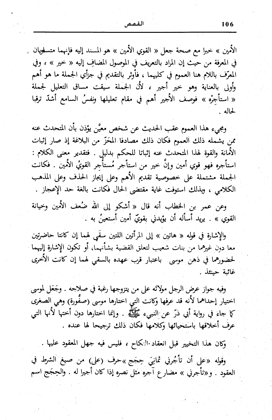 وَمَجِيءُ هَذَا الْعُمُومِ عَقِبَ الْحَدِيثِ عَنْ شَخْصٍ مُعَيَّنٍ يُؤْذِنُ بِأَنَّ الْمُتَحَدَّثَ عَنْهُ مِمَّنْ يَشْمَلُهُ ذَلِكَ الْعُمُومُ فَكَانَ ذَلِكَ مُصَادِفًا الْمَحَزَّ مِنَ الْبَلَاغَةِ إِذْ صَارَ إِثْبَاتُ الْأَمَانَةِ وَالْقُوَّةِ لِهَذَا الْمُتَحَدَّثِ عَنْهُ إِثْبَاتًا لِلْحُكْمِ بِدَلِيلٍ. فَتَقْدِيرُ مَعْنَى الْكَلَامِ: اسْتَأْجِرْهُ فَهُوَ قَوِيٌّ أَمِينٌ وَإِنَّ خَيْرَ مَنِ اسْتَأْجَرَ مُسْتَأْجِرٌ الْقَوِيُّ الْأَمِينُ. فَكَانَتِ الْجُمْلَةُ مُشْتَمِلَةً عَلَى خُصُوصِيَّةِ تَقْدِيمِ الْأَهَمِّ وَعَلَى إِيجَازِ الْحَذْفِ وَعَلَى الْمَذْهَبِ الْكَلَامِيِّ، وَبِذَلِكَ اسْتَوْفَتْ غَايَةَ مُقْتَضَى الْحَالِ فَكَانَتْ بَالِغَةً حَدَّ الْإِعْجَازِ.