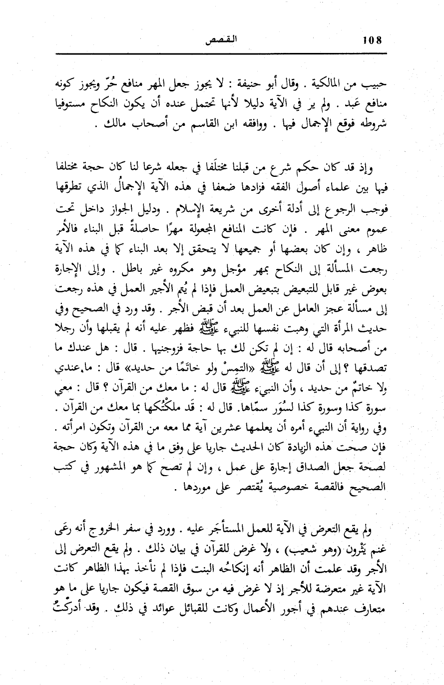 وَإِذْ قَدْ كَانَ حُكْمُ شَرْعِ مَنْ قَبْلَنَا مُخْتَلِفًا فِي جَعْلِهِ شَرْعًا لَنَا كَانَ حُجَّةً مُخْتَلَفًا فِيهَا بَيْنَ عُلَمَاءِ أُصُولِ الْفِقْهِ فَزَادَهَا ضَعْفًا فِي هَذِهِ الْآيَةِ الْإِجْمَالُ الَّذِي تَطَرَّقَهَا فَوَجَبَ الرُّجُوعُ إِلَى أَدِلَّةٍ أُخْرَى مِنْ شَرِيعَةِ الْإِسْلَامِ. وَدَلِيلُ الْجَوَازِ دَاخِلٌ تَحْتَ عُمُومِ مَعْنَى الْمَهْرِ. فَإِنْ كَانَتِ الْمَنَافِعُ الْمَجْعُولَةُ مَهْرًا حَاصِلَةً قَبْلَ الْبِنَاءِ فَالْأَمْرُ ظَاهِرٌ، وَإِنْ كَانَ بَعْضُهَا أَوْ جَمِيعُهَا لَا يَتَحَقَّقُ إِلَّا بَعْدَ الْبِنَاءِ كَمَا فِي هَذِهِ الْآيَةِ رَجَعَتِ الْمَسْأَلَةُ إِلَى النِّكَاحِ بِمَهْرٍ مُؤَجَّلٍ وَهُوَ مَكْرُوهٌ غَيْرُ بَاطِلٍ. وَإِلَى الْإِجَارَةِ بِعِوَضٍ غَيْرِ قَابِلٍ لِلتَّبْعِيضِ بِتَبْعِيضِ الْعَمَلِ فَإِذَا لَمْ يُتِمَّ الْأَجِيرُ الْعَمَلَ فِي هَذِهِ رَجَعَتْ إِلَى مَسْأَلَةِ عَجْزِ الْعَامِلِ عَنِ الْعَمَلِ بَعْدَ أَنْ قَبَضَ الْأَجْرَ.