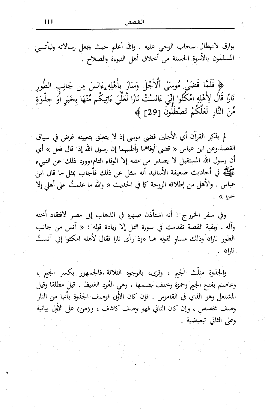 فَلَمَّا قَضى مُوسَى الْأَجَلَ وَسارَ بِأَهْلِهِ آنَسَ مِنْ جانِبِ الطُّورِ نَارًا قالَ لِأَهْلِهِ امْكُثُوا إِنِّي آنَسْتُ نَارًا لَعَلِّي آتِيكُمْ مِنْها بِخَبَرٍ أَوْ جَذْوَةٍ مِنَ النَّارِ لَعَلَّكُمْ تَصْطَلُونَ (29)