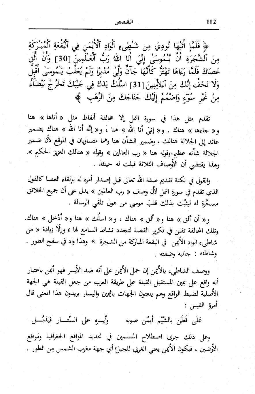 فَلَمَّا أَتاها نُودِيَ مِنْ شاطِئِ الْوادِ الْأَيْمَنِ فِي الْبُقْعَةِ الْمُبارَكَةِ مِنَ الشَّجَرَةِ أَنْ يَا مُوسى إِنِّي أَنَا اللَّهُ رَبُّ الْعالَمِينَ وَأَنْ أَلْقِ عَصاكَ فَلَمَّا رَآها تَهْتَزُّ كَأَنَّها جَانٌّ وَلَّى مُدْبِراً وَلَمْ يُعَقِّبْ يَا مُوسى أَقْبِلْ وَلا تَخَفْ إِنَّكَ مِنَ الْآمِنِينَ اسْلُكْ يَدَكَ فِي جَيْبِكَ تَخْرُجْ بَيْضاءَ مِنْ غَيْرِ سُوءٍ وَاضْمُمْ إِلَيْكَ جَناحَكَ مِنَ الرَّهْبِ تَقَدَّمَ مِثْلُ هَذَا فِي سُورَةِ النَّمْلِ إِلَّا مُخَالَفَةَ أَلْفَاظٍ مِثْلِ أَتاها هُنَا وجاءَها هُنَاكَ [النَّمْل: 8] وإِنِّي أَنَا اللَّهُ هُنَا، وإِنَّهُ أَنَا اللَّهُ هُنَاكَ [النَّمْل: 9] بِضَمِيرٍ عَائِدٍ إِلَى الْجَلَالَةِ هُنَالِكَ، وَضَمِيرِ الشَّأْنِ هُنَا وَهُمَا مُتَسَاوِيَانِ فِي الْمَوْقِعِ لِأَنَّ ضَمِيرَ الْجَلَالَةِ شَأْنُهُ عَظِيمٌ.
