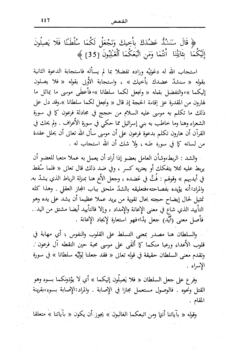 وَالْمُرَادُ: أَنَّهُ يُؤَيِّدُهُ بِفَصَاحَتِهِ، فَتَعْلِيقُهُ بِالشَّدِّ مُلْحَقٌ بِبَابِ الْمَجَازِ الْعَقْلِيِّ. وَهَذَا كُلُّهُ تَمْثِيلٌ لِحَالِ إِيضَاحِ حُجَّتِهِ بِحَالِ تَقْوِيَةِ مَنْ يُرِيدُ عَمَلًا عَظِيمًا أَنْ يُشَدَّ عَلَى يَدِهِ وَهُوَ التَّأْيِيدُ الَّذِي شَاعَ فِي مَعْنَى الْإِعَانَةِ وَالْإِمْدَادِ، وَإِلَّا فَالتَّأْيِيدُ أَيْضًا مُشْتَقٌّ مِنَ الْيَدِ. فَأَصْلُ مَعْنَى (أَيَّدَ) جَعَلَ