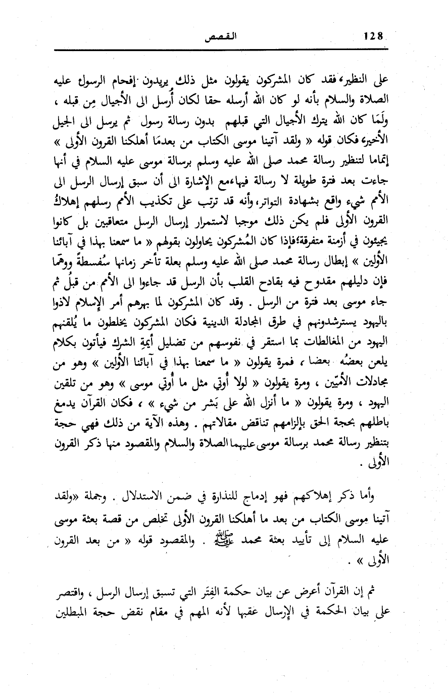 عَلَى النَّظِيرِ، فَقَدْ كَانَ الْمُشْرِكُونَ يَقُولُونَ مِثْلَ ذَلِكَ يُرِيدُونَ إِفْحَامَ الرَّسُولِ عَلَيْهِ الصَّلَاةُ وَالسَّلَامُ بِأَنَّهُ لَوْ كَانَ اللَّهُ أَرْسَلَهُ حَقًّا لَكَانَ أُرْسِلَ إِلَى الْأَجْيَالِ مِنْ قَبْلِهِ، وَلَمَا كَانَ اللَّهُ يَتْرُكُ الْأَجْيَالَ الَّتِي قَبْلَهُمْ بِدُونِ رِسَالَةِ رَسُولٍ ثُمَّ يُرْسِلُ إِلَى الْجِيلِ الْأَخِيرِ، فَكَانَ قَوْلُهُ وَلَقَدْ آتَيْنا مُوسَى الْكِتابَ مِنْ بَعْدِ مَا أَهْلَكْنَا الْقُرُونَ الْأُولى إِتْمَامًا لِتَنْظِيرِ رِسَالَةِ مُحَمَّدٍ صَلَّى اللهُ عَلَيْهِ وَسَلَّمَ بِرِسَالَةِ مُوسَى عَلَيْهِ السَّلَامُ فِي أَنَّهَا جَاءَتْ بَعْدَ فَتْرَةٍ طَوِيلَةٍ لَا رِسَالَةَ فِيهَا، مَعَ الْإِشَارَةِ إِلَى أَنَّ سَبْقَ إِرْسَالِ الرُّسُلِ إِلَى الْأُمَمِ شَيْءٌ وَاقِعٌ بِشَهَادَةِ التَّوَاتُرِ، وَأَنَّهُ قَدْ تَرَتَّبَ عَلَى تَكْذِيبِ الْأُمَمِ رُسُلَهُمْ إِهْلَاكُ الْقُرُونِ الْأُولَى فَلَمْ يَكُنْ ذَلِكَ مُوجِبًا لِاسْتِمْرَارِ إِرْسَالِ الرُّسُلِ مُتَعَاقِبِينَ بَلْ كَانُوا يَجِيئُونَ فِي أَزْمِنَةٍ مُتَفَرِّقَةٍ فَإِذَا كَانَ الْمُشْرِكُونَ يُحَاوِلُونَ بِقَوْلِهِمْ مَا سَمِعْنا بِهذا فِي آبائِنَا الْأَوَّلِينَ [الْقَصَص: 36] إِبْطَالَ رِسَالَةِ مُحَمَّدٍ صَلَّى اللهُ عَلَيْهِ وَسَلَّمَ بِعِلَّةِ تَأَخُّرِ زَمَانِهَا سَفْسَطَةً وَوَهَمًا فَإِنَّ دَلِيلَهُمْ مَقْدُوحٌ فِيهِ بِقَادِحِ الْقَلْبِ بِأَنَّ الرُّسُلَ قَدْ جَاءُوا إِلَى الْأُمَمِ مِنْ قَبْلُ ثُمَّ جَاءَ مُوسَى بَعْدَ فَتْرَةٍ مِنَ الرُّسُلِ. وَقَدْ كَانَ الْمُشْرِكُونَ لَمَّا بَهَرَهُمْ أَمْرُ الْإِسْلَامِ لَاذُوا بِالْيَهُودِ يَسْتَرْشِدُونَهُمْ فِي طُرُقِ الْمُجَادَلَةِ الدِّينِيَّةِ فَكَانَ الْمُشْرِكُونَ يَخْلِطُونَ مَا يُلَقِّنُهُمُ الْيَهُودُ مِنَ الْمُغَالَطَاتِ بِمَا اسْتَقَرَّ فِي نُفُوسِهِمْ مِنْ تَضْلِيلِ أَيِمَّةِ الشِّرْكِ فَيَأْتُونَ بِكَلَامٍ يَلْعَنُ بَعْضُهُ بَعْضًا، فَمَرَّةً يَقُولُونَ مَا سَمِعْنا بِهذا فِي آبائِنَا الْأَوَّلِينَ [الْقَصَص: 36] وَهُوَ مِنْ مُجَادَلَاتِ الْأُمِّيِّينَ، وَمرَّة يَقُولُونَ لَوْلا أُوتِيَ مِثْلَ مَا أُوتِيَ مُوسى [الْقَصَص: 48] وَهُوَ من تلقين الْيَهُود، وَمَرَّةً يَقُولُونَ مَا أَنْزَلَ اللَّهُ عَلى بَشَرٍ مِنْ شَيْءٍ [الْأَنْعَام: 91] ، فَكَانَ الْقُرْآنُ يَدْمَغُ بَاطِلَهُمْ بِحُجَّةِ الْحَقِّ بِإِلْزَامِهِمْ تَنَاقُضَ مَقَالَاتِهِمْ. وَهَذِهِ الْآيَةُ مِنْ ذَلِكَ فَهِيَ حُجَّةٌ بِتَنْظِيرِ رِسَالَةِ مُحَمَّدٍ بِرِسَالَةِ مُوسَى عَلَيْهِمَا الصَّلَاةُ وَالسَّلَامُ وَالْمَقْصُودُ مِنْهَا ذِكْرُ الْقُرُونِ الْأُولَى.