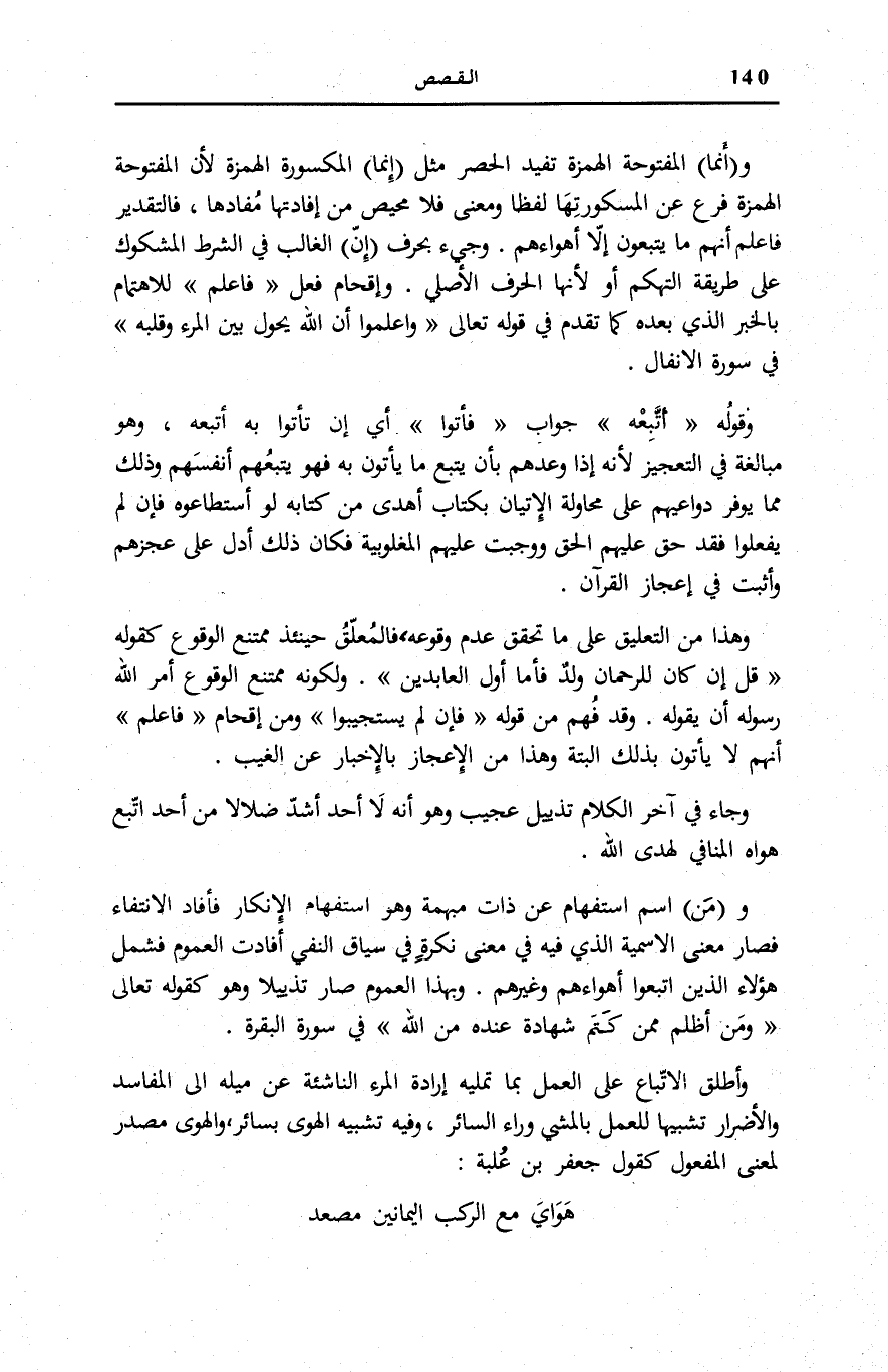 وَ (أَنَّما) الْمَفْتُوحَةُ الْهَمْزَةِ تُفِيدُ الْحَصْرَ مِثْلَ (إِنَّمَا) الْمَكْسُورَةِ الْهَمْزَةِ لِأَنَّ الْمَفْتُوحَةَ الْهَمْزَةِ فَرْعٌ عَنِ الْمَكْسُورَتِهَا لَفْظًا وَمَعْنًى فَلَا محيص من إفادتها مُفَادِهَا، فَالتَّقْدِيرُ فَاعْلَمْ أَنَّهُمْ مَا يَتَّبِعُونَ إِلَّا أَهْوَاءَهُمْ. وَجِيءَ بِحَرْفِ (إِنَّ) الْغَالِبِ فِي الشَّرْطِ الْمَشْكُوكِ عَلَى طَرِيقَةِ التَّهَكُّمِ أَوْ لِأَنَّهَا الْحَرْفُ الْأَصْلِيُّ. وَإِقْحَامُ فِعْلِ فَاعْلَمْ لِلِاهْتِمَامِ بِالْخَبَرِ الَّذِي بَعْدَهُ كَمَا تَقَدَّمَ فِي قَوْلِهِ تَعَالَى وَاعْلَمُوا أَنَّ اللَّهَ يَحُولُ بَيْنَ الْمَرْءِ وَقَلْبِهِ فِي سُورَةِ الْأَنْفَالِ [24] .