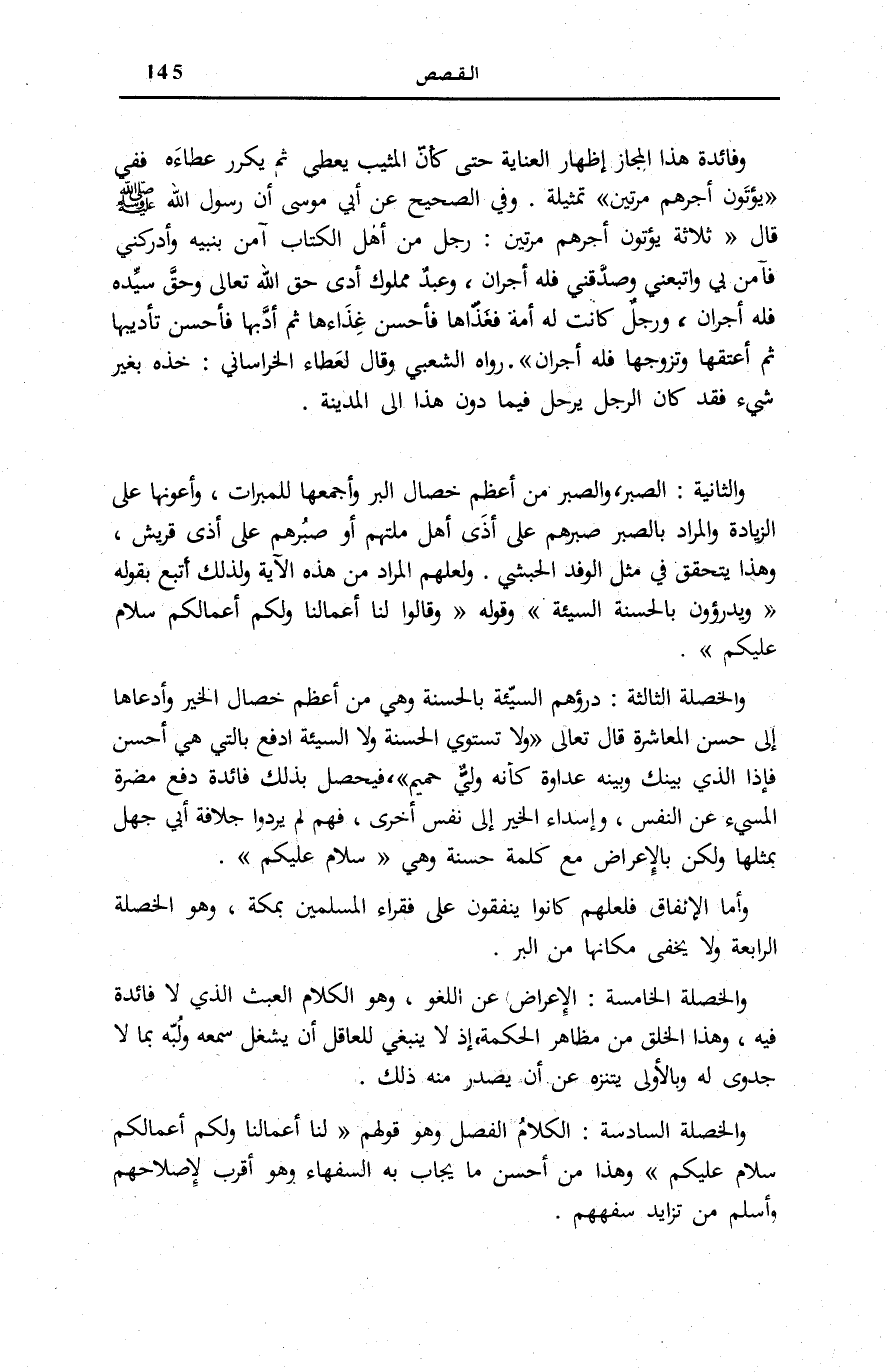 وَالثَّانِيَةُ: الصَّبْرُ، وَالصَّبْرُ مِنْ أَعْظَمِ خِصَالِ الْبِرِّ وَأَجْمَعِهَا لِلْمَبَرَّاتِ، وَأَعْوَنِهَا عَلَى الزِّيَادَةِ وَالْمُرَادُ بِالصَّبْرِ صَبْرُهُمْ عَلَى أَذَى أَهْلِ مِلَّتِهِمْ أَوْ صَبْرُهُمْ عَلَى أَذَى قُرَيْشٍ، وَهَذَا يَتَحَقَّقُ فِي مِثْلِ الْوَفْدِ الْحَبَشِيِّ. وَلَعَلَّهُمُ الْمُرَادُ مِنْ هَذِهِ الْآيَةِ وَلِذَلِكَ أتبع بقوله وَيَدْرَؤُنَ بِالْحَسَنَةِ السَّيِّئَةَ وَقَوْلِهِ وَقالُوا لَنا أَعْمالُنا وَلَكُمْ أَعْمالُكُمْ سَلامٌ عَلَيْكُمْ.