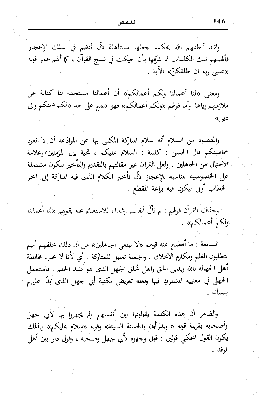 وَالْمَقْصُودُ مِنَ السَّلَامِ أَنَّهُ سَلَامُ الْمُتَارَكَةِ الْمُكَنَّى بِهَا عَنِ الْمُوَادَعَةِ أَنْ لَا نَعُودَ لِمُخَاطَبَتِكُمْ قَالَ الْحَسَنُ: كَلِمَةُ: السَّلَامُ عَلَيْكُمْ، تَحِيَّةٌ بَيْنَ الْمُؤْمِنِينَ، وَعَلَامَةُ الِاحْتِمَالِ مِنَ الْجَاهِلِينَ. وَلَعَلَّ الْقُرْآنَ غَيَّرَ مَقَالَتَهُمْ بِالتَّقْدِيمِ وَالتَّأْخِيرِ لِتَكُونَ مُشْتَمِلَةً عَلَى الْخُصُوصِيَّةِ الْمُنَاسِبَةِ لِلْإِعْجَازِ لِأَنَّ تَأْخِيرَ الْكَلَامِ الَّذِي فِيهِ الْمُتَارَكَةُ إِلَى آخِرِ الِخِطَابِ أَوْلَى لِيَكُونَ فِيهِ بَرَاعَةُ الْمَقْطَعِ.