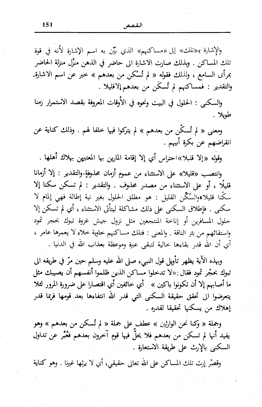 وَانْتَصَبَ قَلِيلًا عَلَى الِاسْتِثْنَاءِ مِنْ عُمُومِ أَزْمَانٍ مَحْذُوفَةٍ. وَالتَّقْدِير: إِلَّا زَمَانا قَلِيلًا، أَوْ عَلَى الِاسْتِثْنَاءِ مِنْ مَصْدَرٍ مَحْذُوفٍ. وَالتَّقْدِيرُ: لَمْ تُسْكَنْ سَكَنًا إِلَّا سَكَنًا قَلِيلًا، وَالسَّكَنُ الْقَلِيلُ: هُوَ مُطْلَقُ الْحُلُولِ بِغَيْرِ نِيَّةِ إِطَالَةٍ فَهِيَ إِلْمَامٌ لَا سُكْنَى. فَإِطْلَاقُ السُّكْنَى عَلَى ذَلِكَ مُشَاكَلَةٌ لِيَتَأَتَّى الِاسْتِثْنَاءُ، أَيْ لَمْ تُسْكَنْ إِلَّا حُلُولَ الْمُسَافِرِينَ أَوْ إِنَاخَةَ الْمُنْتَجَعَيْنِ مِثْلَ نُزُولِ جَيْشِ غَزْوَةِ تَبُوكَ بِحِجْرِ ثَمُودَ وَاسْتِقَائِهِمْ مِنْ بِئْرِ النَّاقَةِ. وَالْمَعْنَى: فَتِلْكَ مَسَاكِنُهُمْ خَاوِيَةً خَلَاءً لَا يَعْمُرُهَا عَامِرٌ، أَيْ أَنَّ اللَّهَ قَدَّرَ بَقَاءَهَا خَالِيَةً لِتَبْقَى عِبْرَةً وَمَوْعِظَةً بِعَذَابِ اللَّهِ فِي الدُّنْيَا.