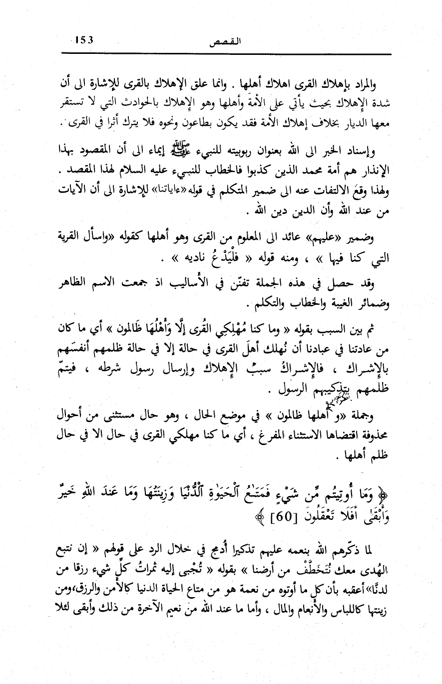ثُمَّ بَيَّنَ السَّبَبَ بِقَوْلِهِ وَما كُنَّا مُهْلِكِي الْقُرى إِلَّا وَأَهْلُها ظالِمُونَ أَيْ مَا كَانَ مِنْ عَادَتِنَا فِي عِبَادِنَا أَنْ نُهْلِكَ أَهْلَ الْقُرَى فِي حَالَة إِلَّا فِي حَالَةِ ظُلْمِهِمْ أَنْفُسَهُمْ بِالْإِشْرَاكِ، فَالْإِشْرَاكُ سَبَبُ الْإِهْلَاكِ وَإِرْسَالُ رَسُولٍ شَرْطُهُ، فَيَتِمُّ ظُلْمُهُمْ بِتَكْذِيبِهِمُ الرَّسُولِ.