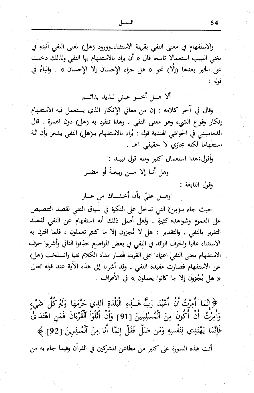 إِنَّما أُمِرْتُ أَنْ أَعْبُدَ رَبَّ هذِهِ الْبَلْدَةِ الَّذِي حَرَّمَها وَلَهُ كُلُّ شَيْءٍ وَأُمِرْتُ أَنْ أَكُونَ مِنَ الْمُسْلِمِينَ (91) وَأَنْ أَتْلُوَا الْقُرْآنَ فَمَنِ اهْتَدى فَإِنَّما يَهْتَدِي لِنَفْسِهِ وَمَنْ ضَلَّ فَقُلْ إِنَّما أَنَا مِنَ الْمُنْذِرِينَ (92)