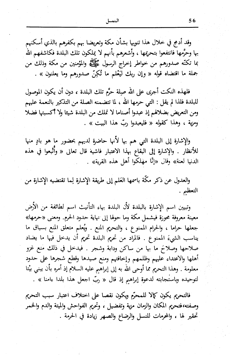 فَلِهَذِهِ النُّكَتِ أَجْرَى عَلَى اللَّهِ صِلَةَ حَرَّمَ تِلْكَ الْبَلْدَةَ، دُونَ أَنْ يَكُونَ الْمَوْصُولُ لِلْبَلْدَةِ فَلِذَا لَمْ يَقُلْ: الَّتِي حَرَّمَهَا اللَّهُ، لِمَا تَتَضَمَّنُهُ الصِّلَةُ مِنَ التَّذْكِيرِ بِالنِّعْمَةِ عَلَيْهِمْ وَمِنَ التَّعْرِيضِ بِضَلَالِهِمْ إِذْ عَبَدُوا أَصْنَامًا لَا تَمْلِكُ مِنَ الْبَلْدَةِ شَيْئًا وَلَا أَكْسَبَتْهَا فَضْلًا وَمَزِيَّةً، وَهَذَا كَقَوْلِه لْيَعْبُدُوا رَبَّ هذَا الْبَيْتِ