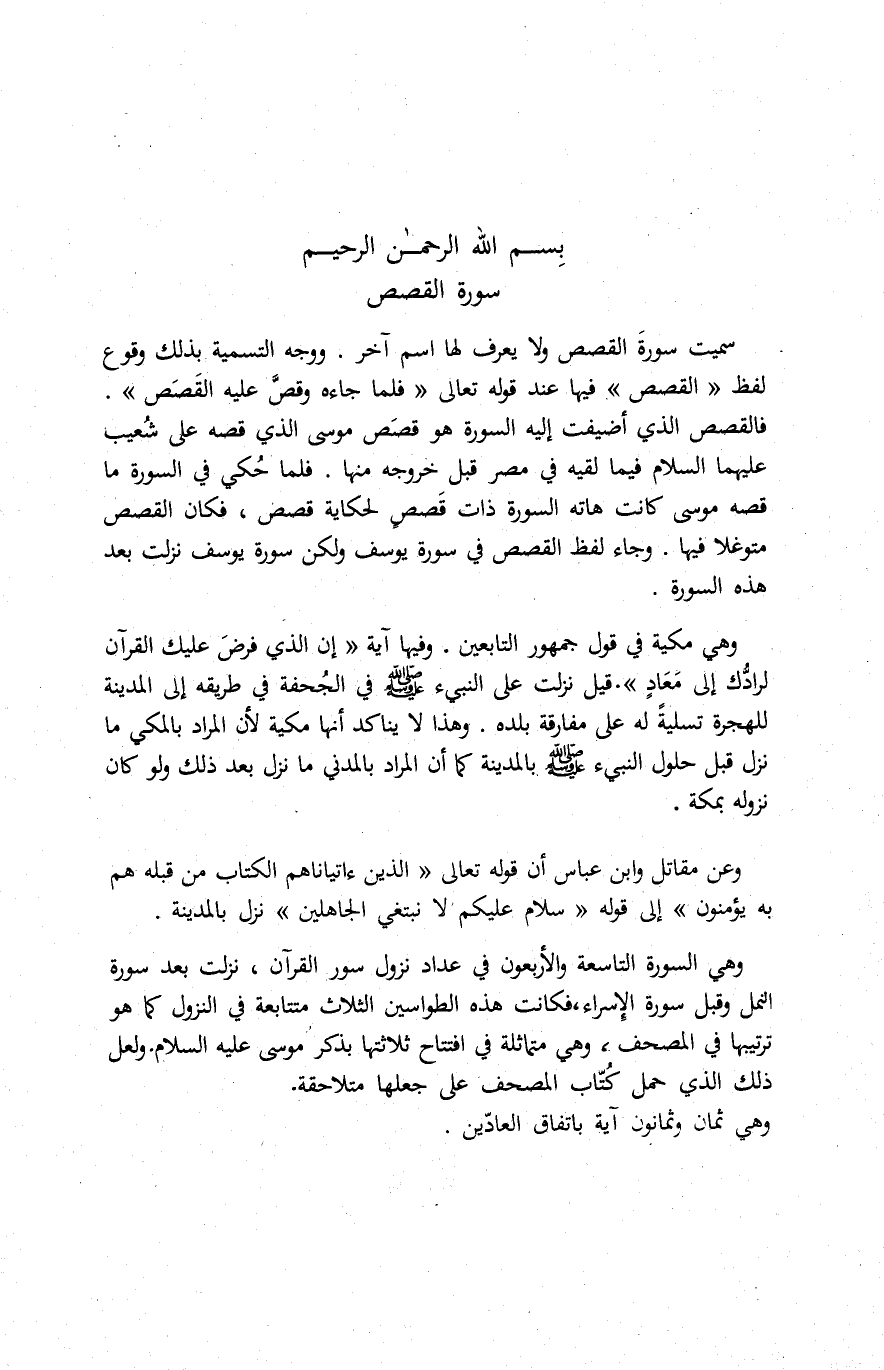 وَهِيَ مَكِّيَّةٌ فِي قَوْلِ جُمْهُورِ التَّابِعِينَ. وَفِيهَا آيَةُ إِنَّ الَّذِي فَرَضَ عَلَيْكَ الْقُرْآنَ لَرادُّكَ إِلى مَعادٍ [الْقَصَص: 85] . قِيلَ نَزَلَتْ عَلَى النَّبِيءِ صَلَّى اللهُ عَلَيْهِ وَسَلَّمَ فِي الْجُحْفَةِ فِي طَرِيقِهِ إِلَى الْمَدِينَةِ لِلْهِجْرَةِ تَسْلِيَةً لَهُ عَلَى مُفَارَقَةِ بَلَدِهِ. وَهَذَا لَا يُنَاكِدُ أَنَّهَا مَكِّيَّةٌ لِأَنَّ الْمُرَادَ بِالْمَكِّيِّ مَا نَزَلْ قَبْلَ حُلُولِ النَّبِيءِ صَلَّى اللهُ عَلَيْهِ وَسَلَّمَ بِالْمَدِينَةِ كَمَا أَنَّ الْمُرَادَ بِالْمَدَنِيِّ مَا نَزَلْ بَعْدَ ذَلِكَ وَلَوْ كَانَ نُزُولُهُ بِمَكَّةَ.
