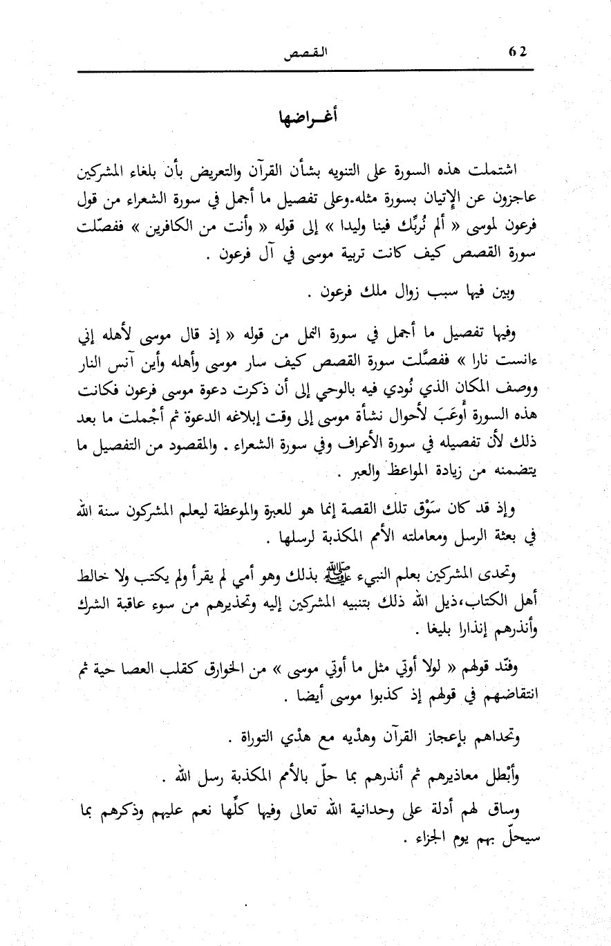 اشْتَمَلَتْ هَذِهِ السُّورَةُ عَلَى التَّنْوِيهِ بِشَأْنِ الْقُرْآنِ وَالتَّعْرِيضِ بِأَنَّ بُلَغَاءَ الْمُشْرِكِينَ عَاجِزُونَ عَنِ الْإِتْيَانِ بِسُورَةٍ مِثْلِهِ. وَعَلَى تَفْصِيلِ مَا أُجْمِلَ فِي سُورَةِ الشُّعَرَاءِ [18، 19] مِنْ قَوْلِ فِرْعَوْنَ لِمُوسَى أَلَمْ نُرَبِّكَ فِينا وَلِيداً إِلَى قَوْلِهِ وَأَنْتَ مِنَ الْكافِرِينَ فَفَصَّلَتْ سُورَةُ الْقَصَصِ كَيْفَ كَانَتْ تَرْبِيَةُ مُوسَى فِي آلِ فِرْعَوْنَ.